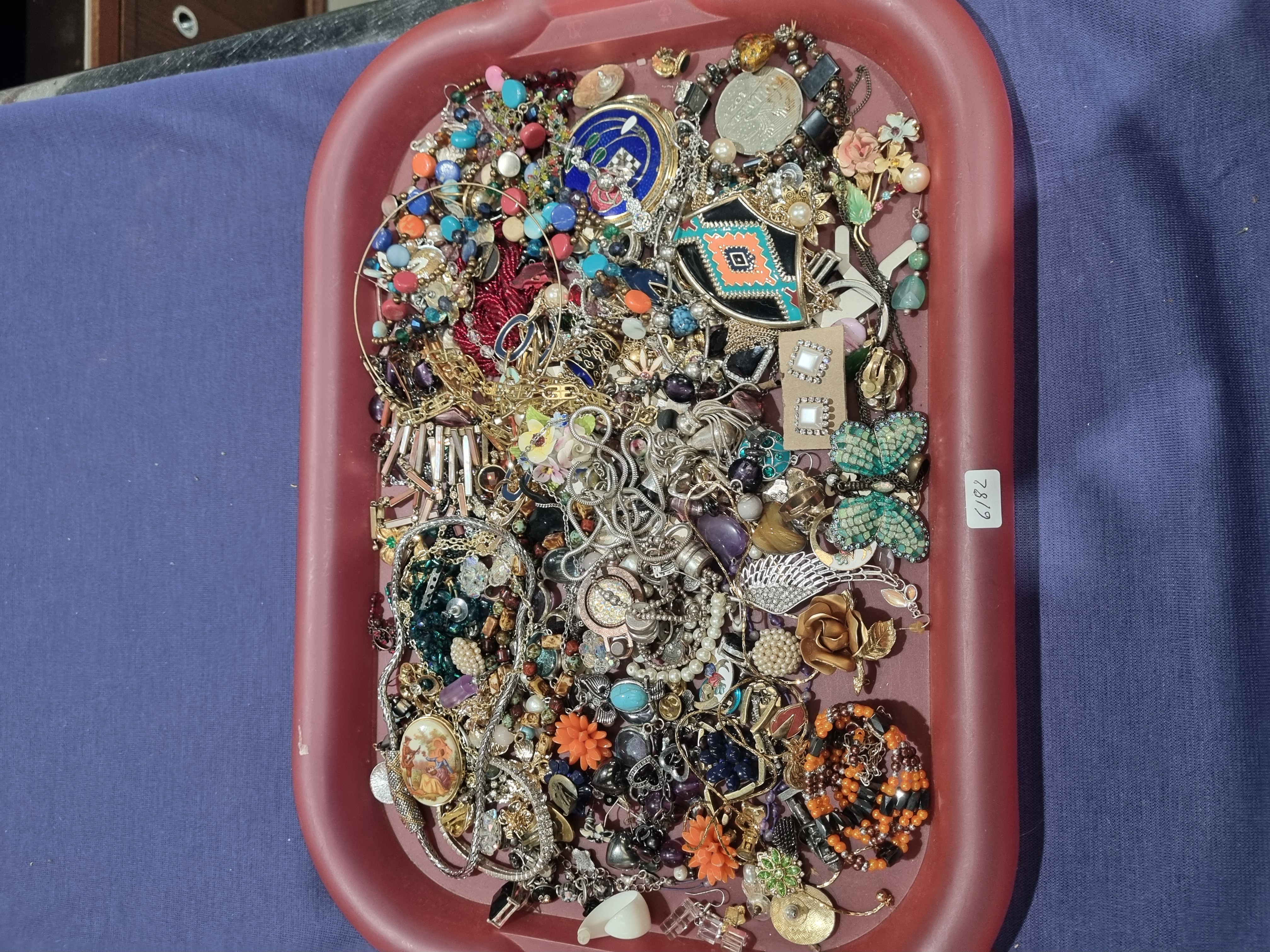 An assortment of vintage and contemporary costume jewellery and accessories. The collection includes a variety of necklaces such as multiple beaded strands in turquoise, red, orange, and white tones, gold-tone and silver-tone chains, and a green beaded necklace featuring faux-pearl accents. The selection of brooches is diverse, featuring a large circular blue enamelled piece with a central coat of arms, a geometric shield-shaped brooch with black, turquoise, and orange enamel, and a large butterfly-form brooch encrusted with green rhinestones. Other brooches include a gold-tone rose, various floral designs with painted or enamelled details, and a large oval brooch with a transfer-printed scene of a couple in 18th-century style dress. The lot also contains a pair of square rhinestone-set stud earrings on their original card, various drop and hoop earrings, a silver-tone wing-shaped pendant set with clear rhinestones, a small circular watch face component, and several beaded stretch bracelets. A silver-coloured commemorative medallion from the reign of Queen Elizabeth II, dating to the 1970s, is included. A white inventory sticker marked 7819 is present on the tray. Materials comprise base metals with gold-tone and silver-tone finishes, enamel, glass and plastic beads, faux pearls, and rhinestones.