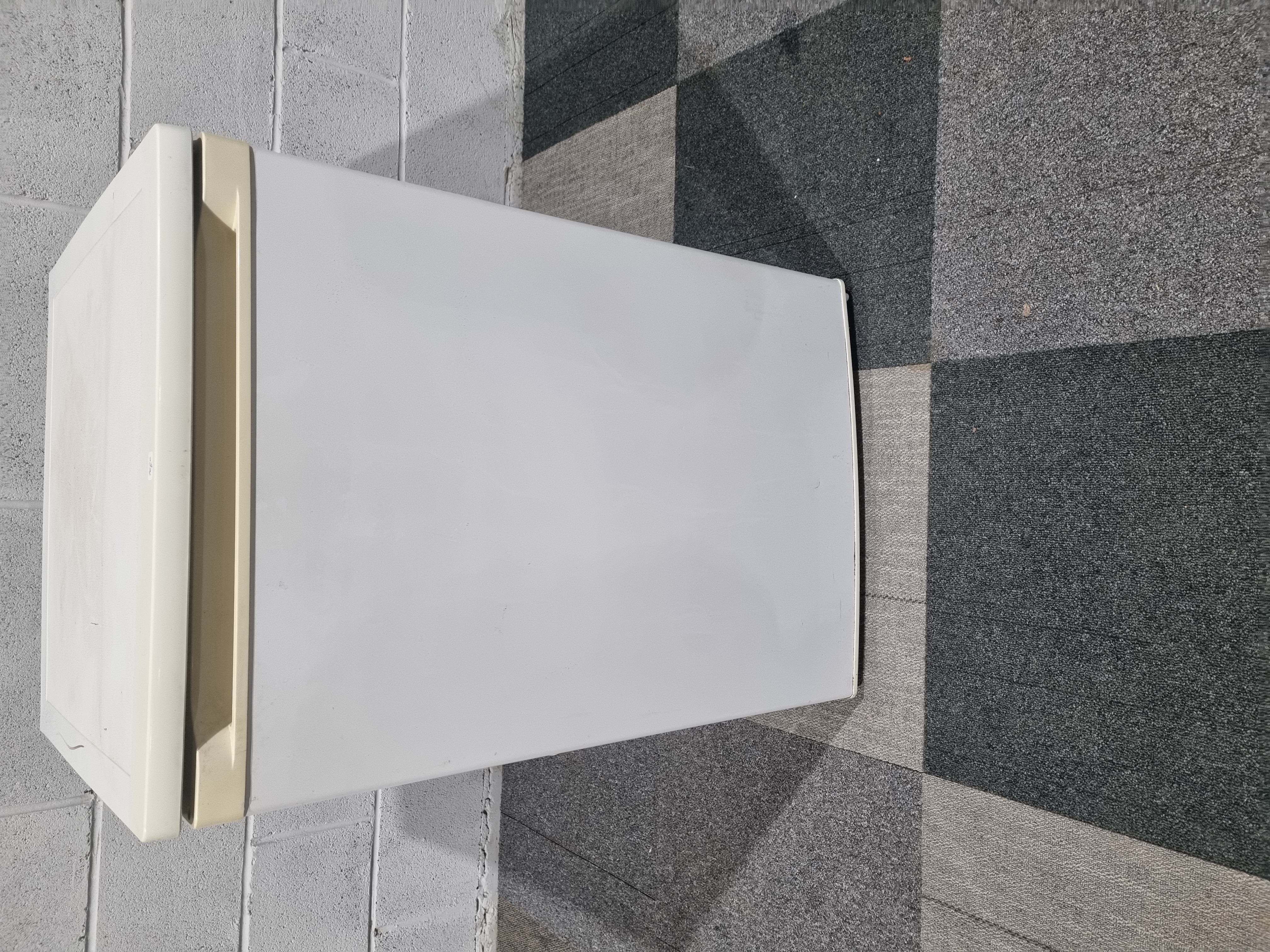 An under-counter freezer featuring a white exterior and a recessed handle integrated into the top of the door. The interior contains three transparent plastic pull-out storage drawers. An internal temperature control dial is located on the upper frame of the unit.