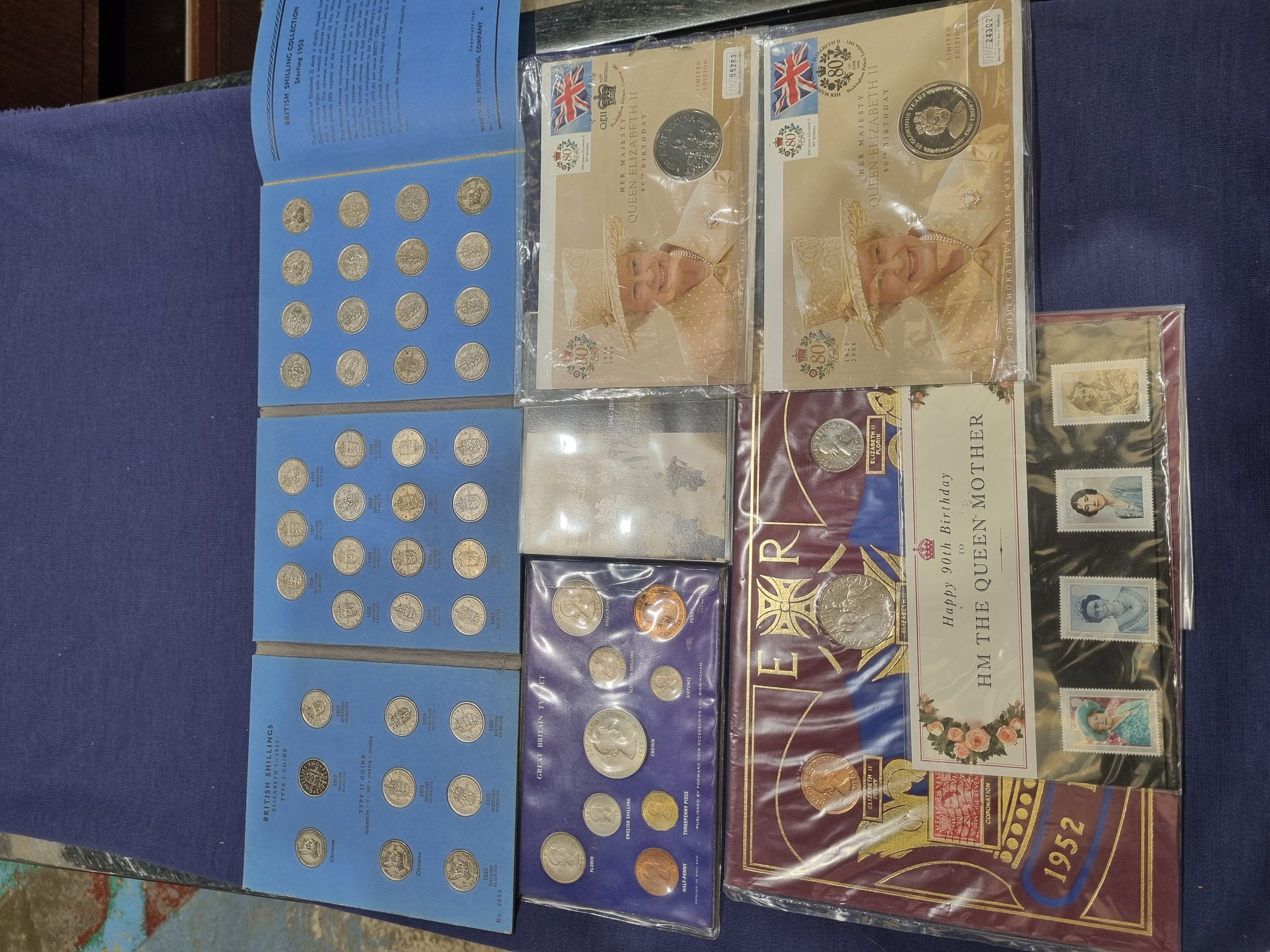 A collection of United Kingdom numismatic and philatelic items primarily issued during the reign of Queen Elizabeth II. The lot includes three blue coin folders titled British Shilling Collection Starting 1953 and British Shillings Elizabeth II 1953-, containing various silver-coloured base metal shillings. Two commemorative philatelic and numismatic covers issued for the 80th Birthday of Queen Elizabeth II in 2006 are present, featuring limited edition serial numbers 05263 and 24302, each containing a silver-coloured commemorative crown or medallion. A Great Britain Type Set is held within a purple plastic sleeve, containing pre-decimal denominations including a half-crown, florin, English and Scottish shillings, sixpence, brass threepence, penny, and halfpenny in silver-coloured and copper-coloured base metals. Additionally, the collection includes a commemorative set for the 90th Birthday of HM The Queen Mother dated 1990, featuring postage stamps and a silver-coloured commemorative crown. The obverses feature portraits of Queen Elizabeth II or the Queen Mother with various heraldic and symbolic reverses.