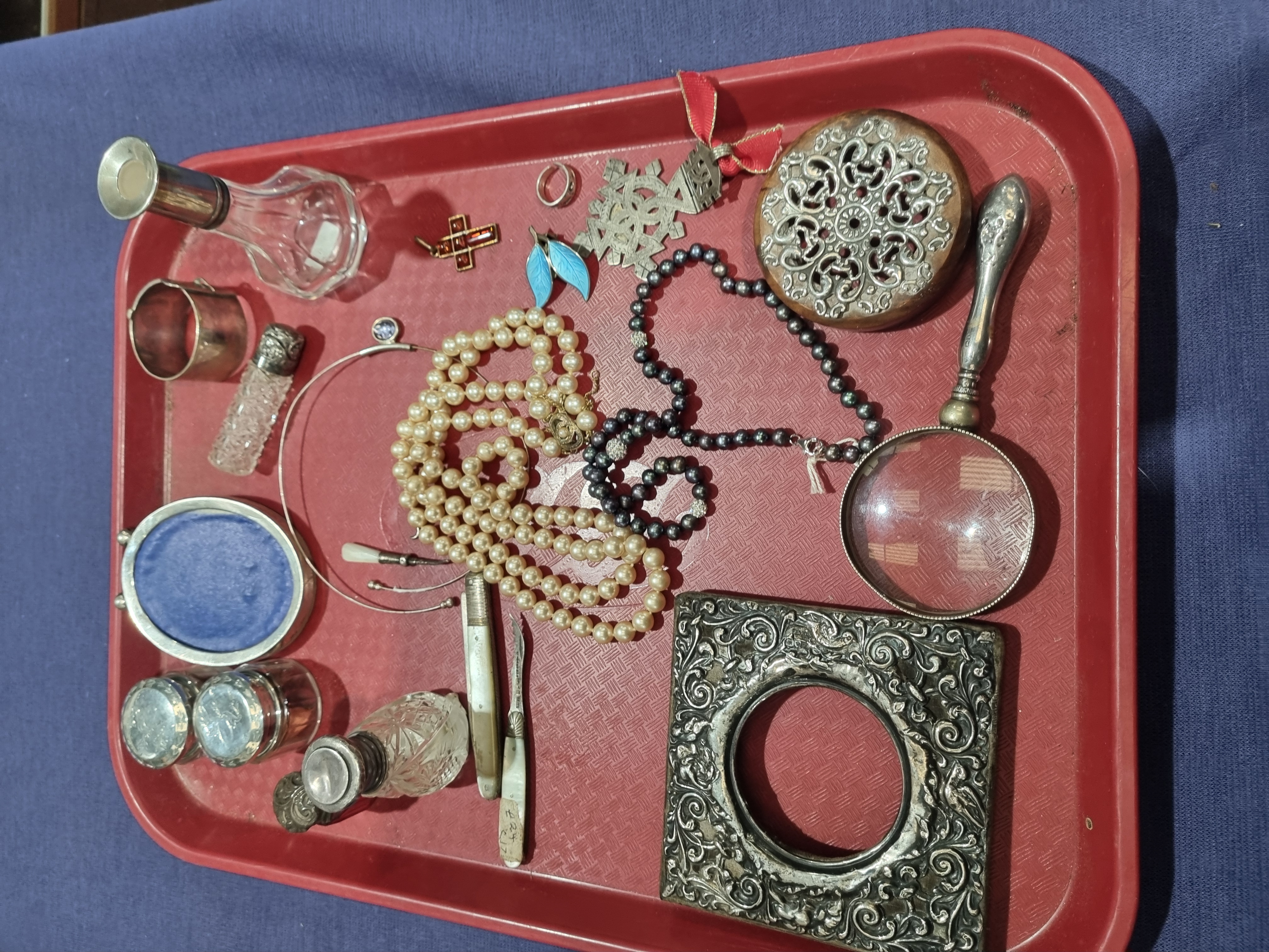 An assortment of personal effects and jewellery comprising various white metal and glass items. The collection includes two necklaces of spherical beads, one with an off-white and one with a dark grey lustre. Decorative objects include an ornate square picture frame featuring scrolling repoussé decoration in a white metal, and a magnifying glass with a decorative silver-toned handle. Glassware consists of several scent bottles with white metal collars and caps. Further items include a circular white metal trinket box with a blue fabric lining, a round wooden box with a pierced metal lid, and a folding knife with mother-of-pearl handle scales. The knife handle is inscribed with the numbers 1, 9, 2, 4 and illegible cursive script. The jewellery selection features a fine white metal wire choker terminating in stones that appear to be blue, a cross pendant set with faceted red stones, a plain white metal band ring, and a pair of blue leaf-shaped earrings. No hallmarks or purity stamps are visible on the metal components; items appear to be silver or silver-toned metal.