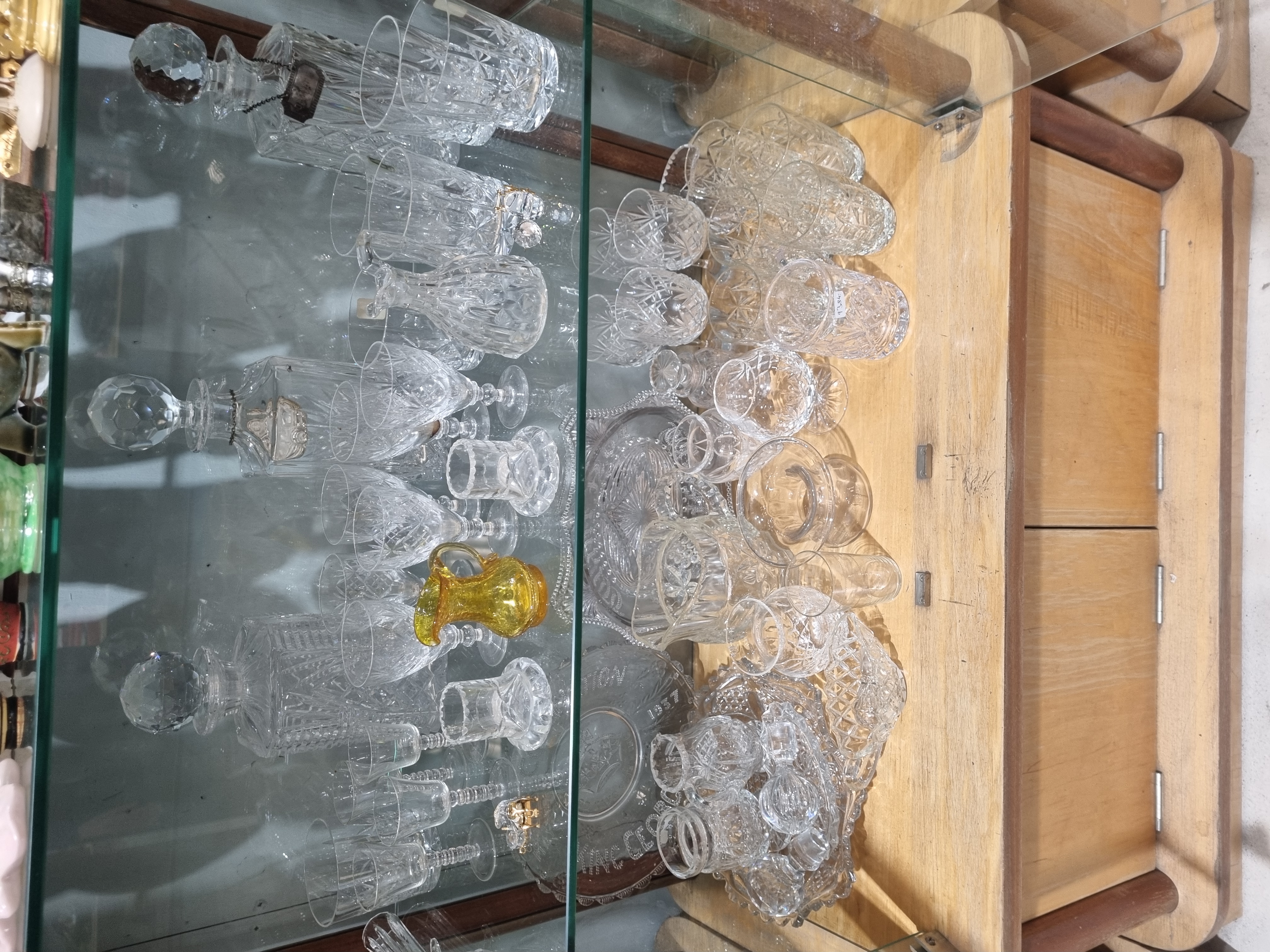 This collection comprises an assortment of cut lead crystal and pressed glassware. The lot features three decanters with various cut patterns, including diamond and fan motifs, each fitted with a facet-cut globular stopper and fluted neck. The drinking suite includes several wine glasses, sherry glasses, and tumblers, many of which display traditional diamond-cut patterns, notched stems, and star-cut bases. A notable inclusion is a circular pressed glass plate embossed with the text KING GEORGE VI CORONATION 1937. Decorative items include a small amber-coloured glass cream jug and several bowls and dishes with varied pressed and cut patterns. The clarity and refractive quality of the larger pieces suggest a high lead content consistent with lead crystal, while the smaller items and the commemorative plate are of pressed glass construction. The items are in the style of mid-20th-century British crystal houses.