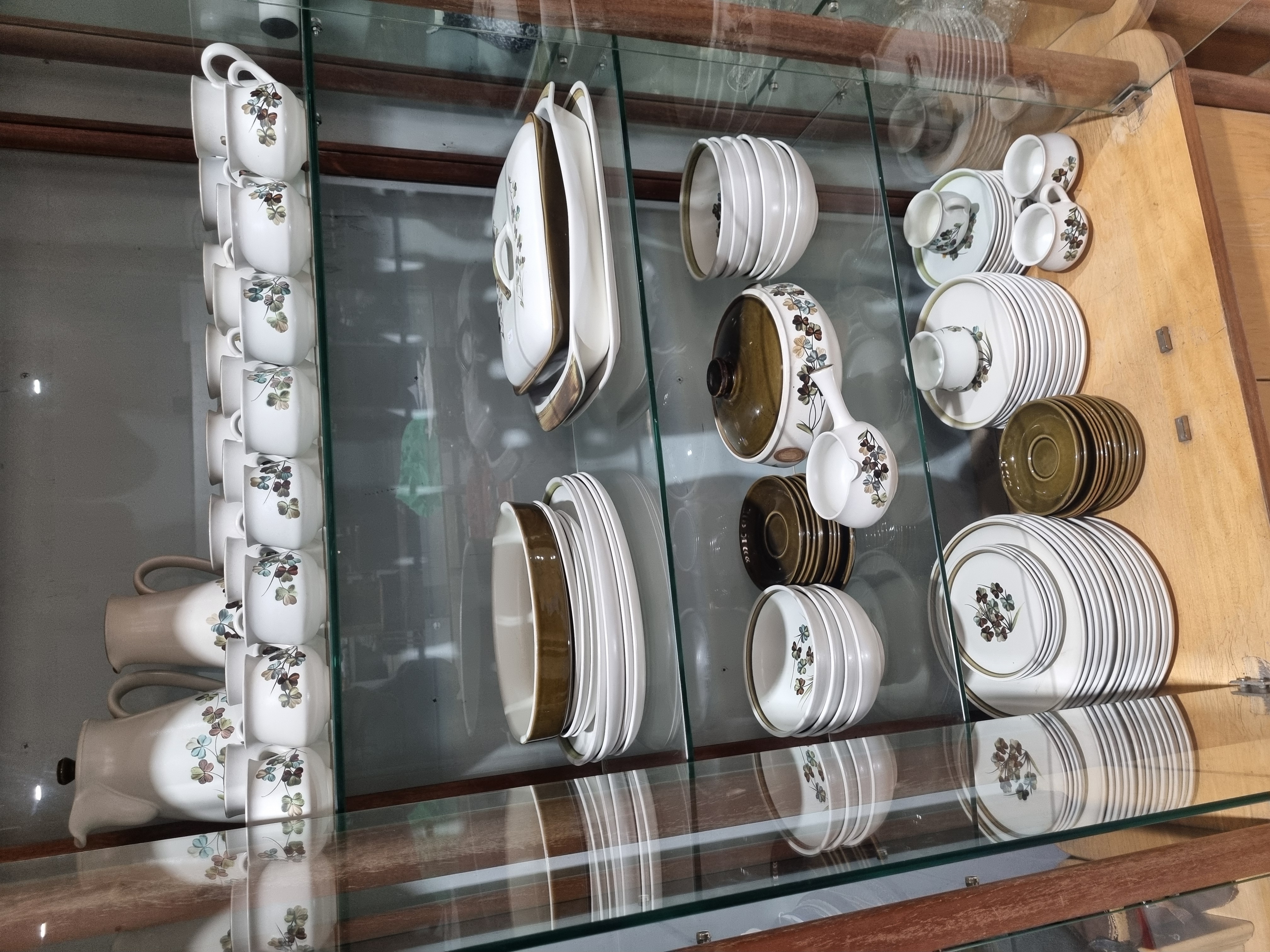 A comprehensive stoneware dinner and tea service manufactured by Denby, England, in the Cotswold pattern. This service is a classic example of mid-to-late 20th-century British stoneware design. The pieces are decorated with transfer-printed stylized floral and leaf motifs in shades of brown and green against a speckled cream ground. Certain components, including the saucers, lids, and the exteriors of specific bowls, feature a contrasting solid dark brown glaze. The collection includes a variety of forms such as tea and coffee cups, a pair of large water or milk jugs, an assortment of dinner, side, and tea plates, numerous soup and cereal bowls, a lidded tureen, open vegetable dishes, and a gravy boat on a fixed stand. Matching saucers, creamers, and open sugar bowls are also present. The base of the pieces bears the blue circular Denby Stoneware mark with the vertical inscription Made in England.