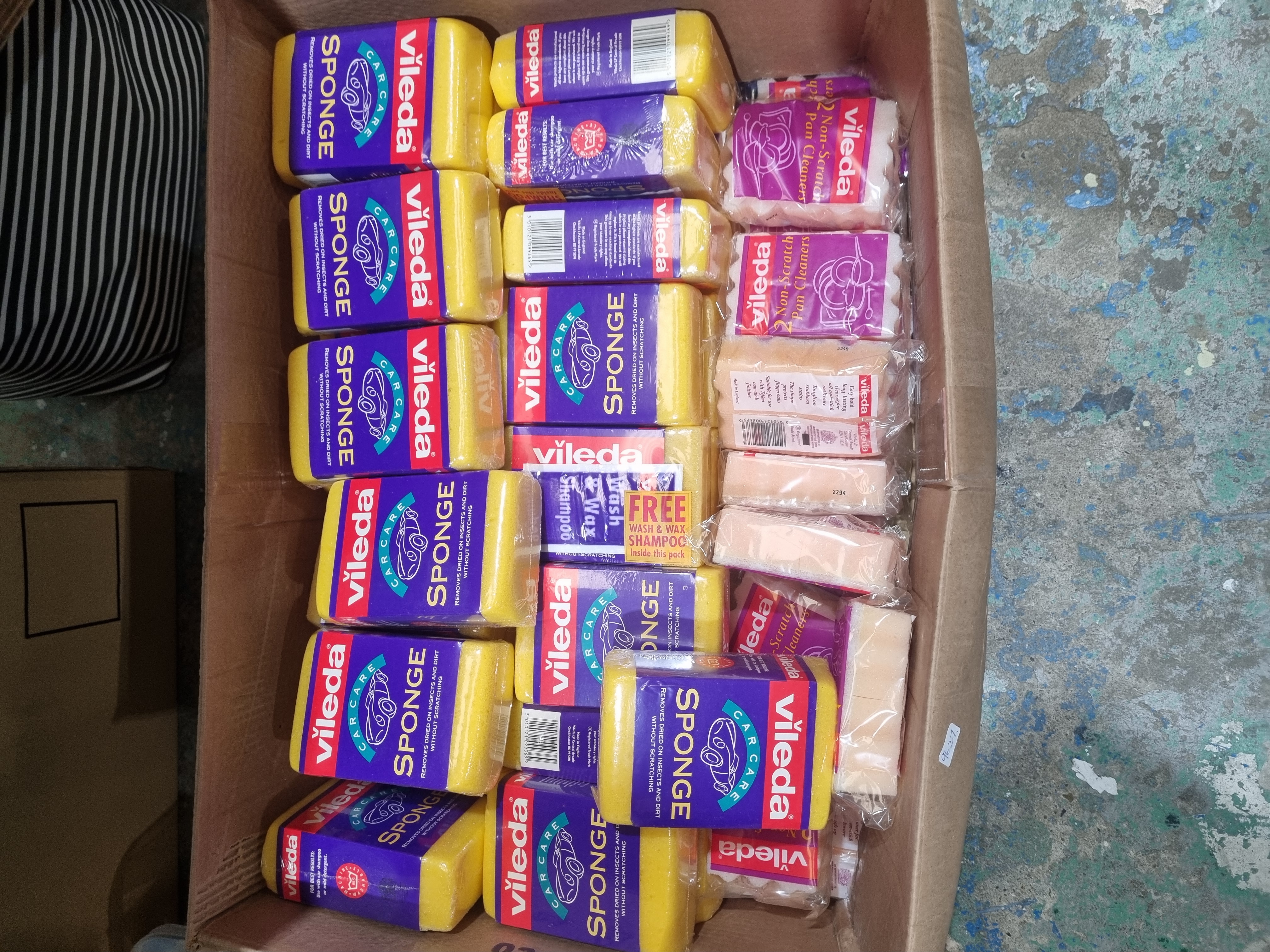 A collection of Vileda brand cleaning products. The lot primarily consists of Carcare Sponges featuring yellow sponge material with purple and red retail wrapping. Several units include a promotional Free Wash and Wax Shampoo inside the packaging. The assortment also contains Vileda Non-Scratch Pan Cleaners in multi-pack retail units and individual beige sponges in clear plastic wrapping. Visible markings include the Vileda brand name and labels indicating the products are Made in England. Individual barcodes, including 5010127013483, are present on the packaging.