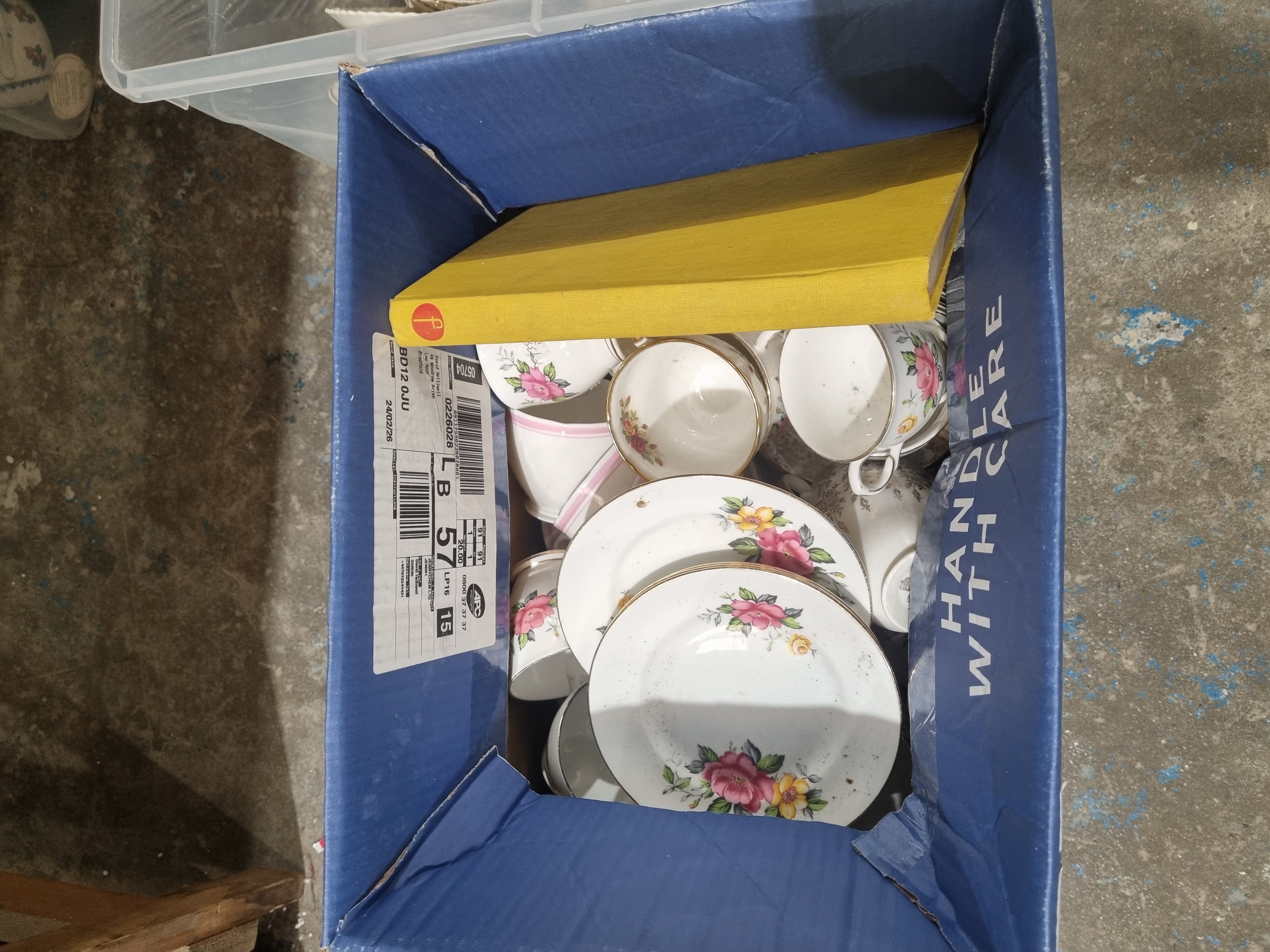 An assortment of glazed white bone china tea wares, including cups and saucers. The pieces are decorated with transfer-printed floral patterns featuring large pink blooms, smaller yellow and red flowers, and green foliage. Several items are finished with gilt-lined rims. The collection includes various forms, such as traditional bell-shaped cups and a waisted cup with a pink-banded foot. No factory marks are visible on the bases of the items as positioned. The style is characteristic of mid-20th-century British commercial tea services, resembling patterns by makers such as Royal Sutherland, Sadler, or Elizabethan. Included in the lot is a yellow cloth-bound book.