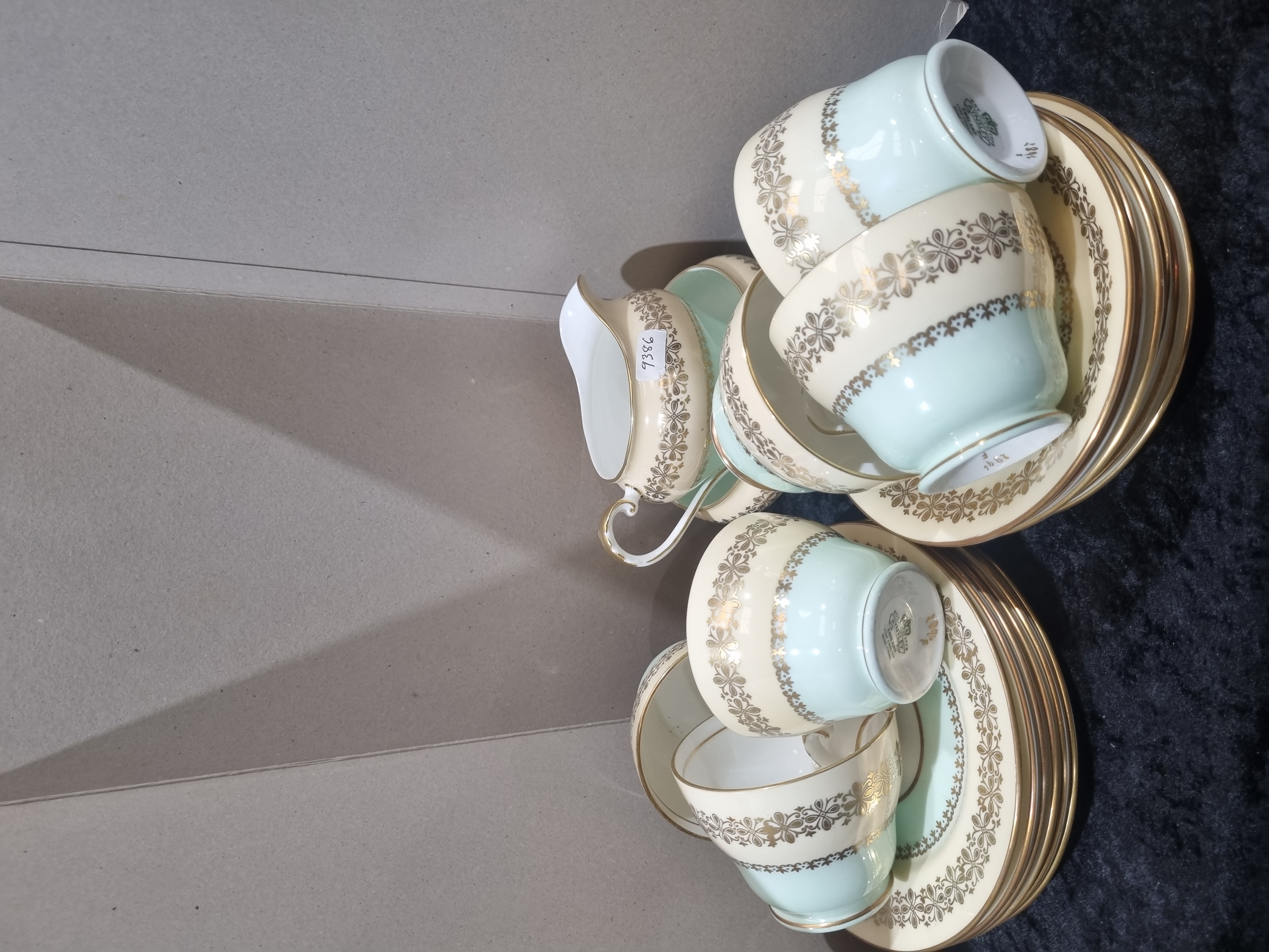 An Aynsley fine English bone china tea service. The set is decorated with a pattern featuring alternating panels of pale turquoise and white, separated and bordered by elaborate gilded scrollwork and foliate bands. The items feature gilded rims, handles, and foot rings. The service comprises six pedestal-footed teacups with scroll handles, six saucers, six side plates, and one cream jug. The base of each piece bears a green underglaze factory mark consisting of a crown emblem above a banner with the name AYNSLEY, accompanied by the text EST. 1775, ENGLAND, and FINE ENGLISH BONE CHINA. A handwritten pattern number 2892 over the letter F is present in gold.