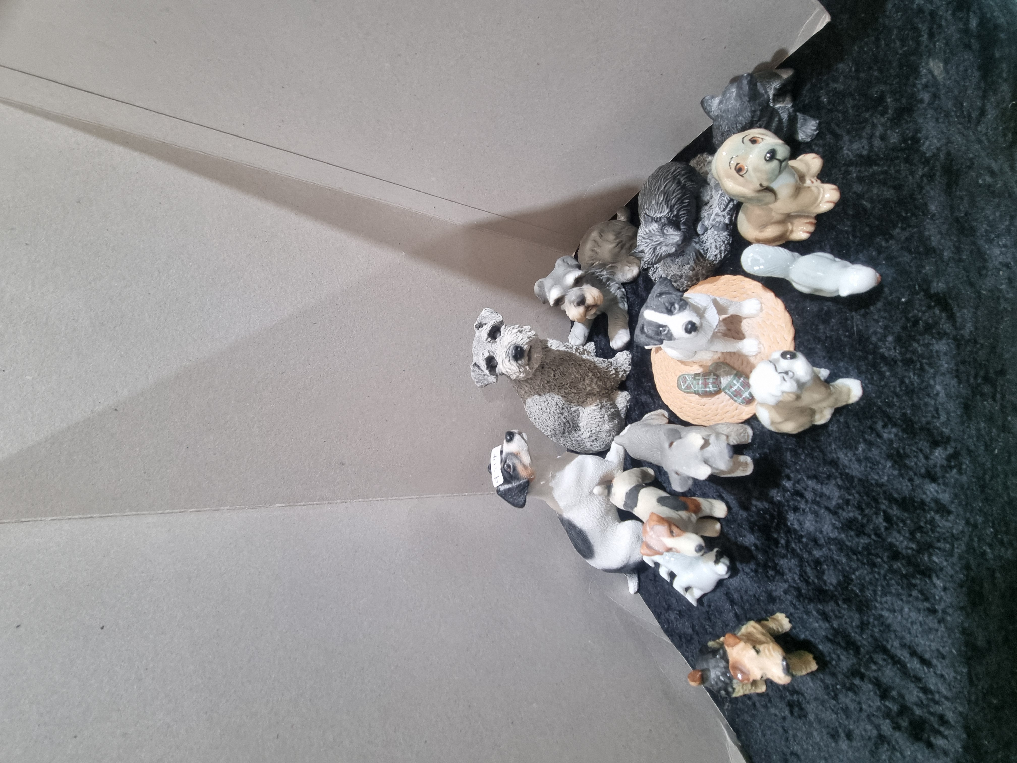A collection of dog figurines featuring a variety of breeds and styles. The group includes a large textured grey terrier, possibly a Schnauzer, accompanied by a smaller matching figure. Also present is a black and white sheepdog in the style of a Border Collie seated on a circular textured mat, a Jack Russell terrier type, and a shaggy dog resembling a Yorkshire Terrier. The assortment contains several smaller puppy figurines in various poses and colours, including tan, white, and multi-coloured examples. One figure is a stylised pale blue-grey dog. The items are constructed from a mix of materials; the more detailed matte-finish pieces are likely cast resin, while the smooth, glossy figures are glazed ceramic or porcelain. Some pieces in the collection resemble the style of Stone Critters and Puppy in my Pocket figurines.