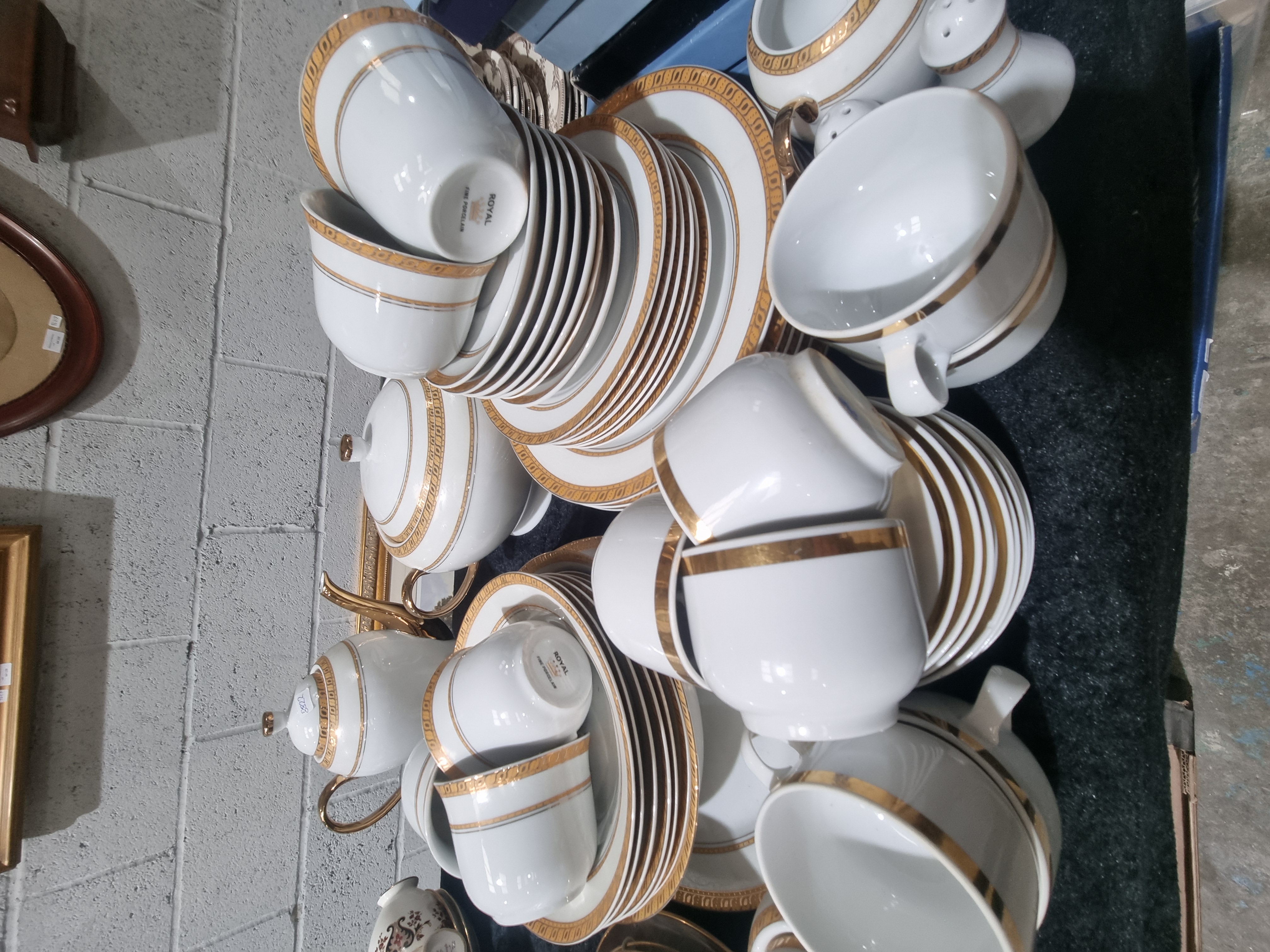 A comprehensive porcelain dinner and tea service bearing the mark of Royal Fine Porcelain. The service is constructed from white porcelain and features a broad gold-tone border decorated with a continuous geometric Greek key motif, bordered by thin gilt bands. The gilding appears to be transfer-applied. The handles and finials of the lidded pieces and cups are further accented with gilt highlights. The collection comprises various forms including dinner plates, side plates, saucers, teacups, coffee cups, twin-handled soup bowls, lidded serving tureens, a lidded teapot, a lidded sugar bowl, a cream jug, and a pair of salt and pepper shakers. The base of the items features a printed mark in black consisting of a central crown symbol with the word ROYAL positioned above and FINE PORCELAIN positioned below.