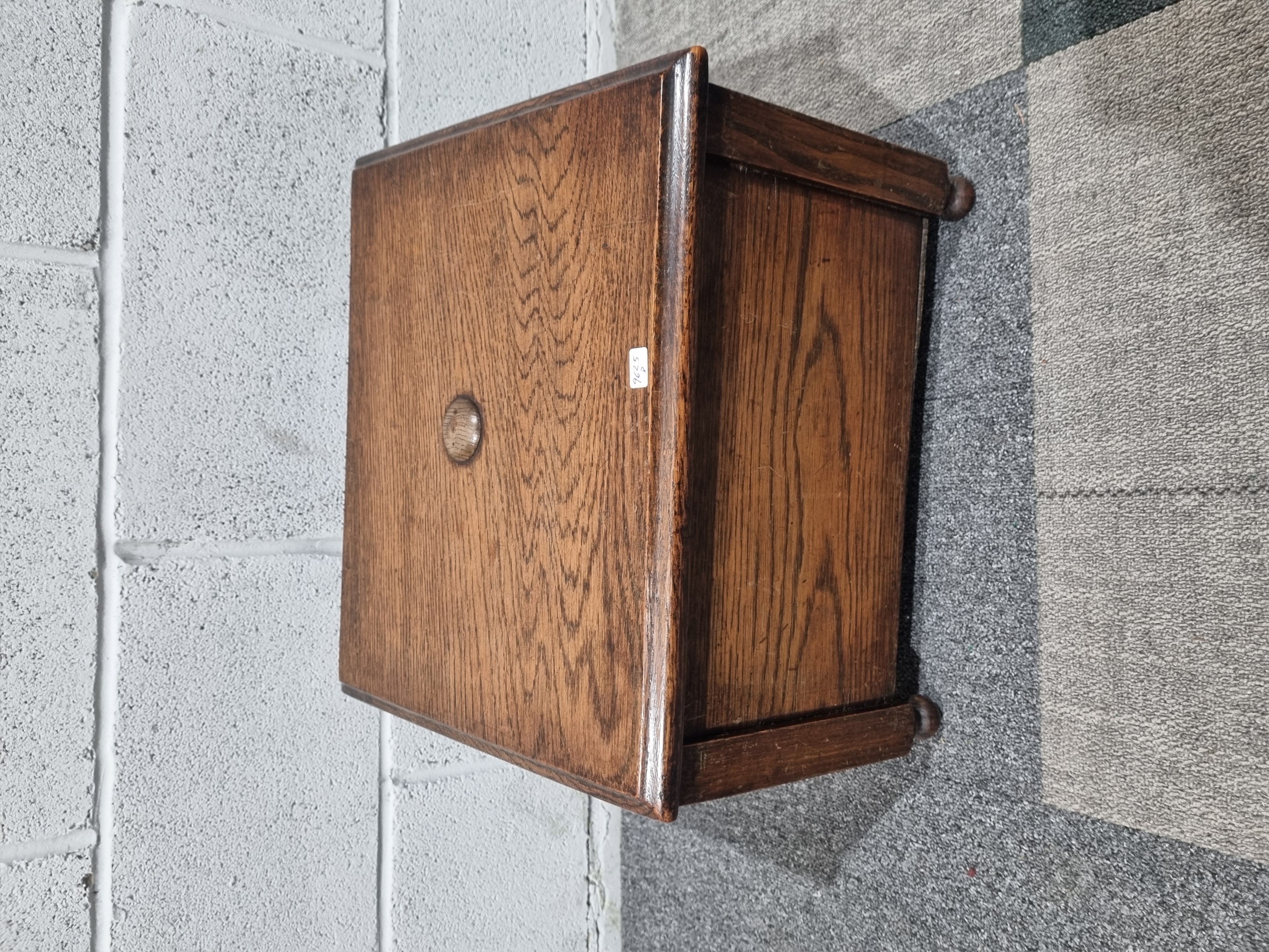 A late Victorian or Edwardian oak box of rectangular form, the hinged lid opening to reveal a plain, unlined interior. The piece is constructed from solid oak with prominent grain patterns and features a small central wooden knob to the lid and a panelled body raised on four bun feet. A small white rectangular adhesive label with the handwritten digits 9, 6, 2, 5 is present on the lid. No other maker’s marks or stamps are visible on the exterior or interior surfaces.