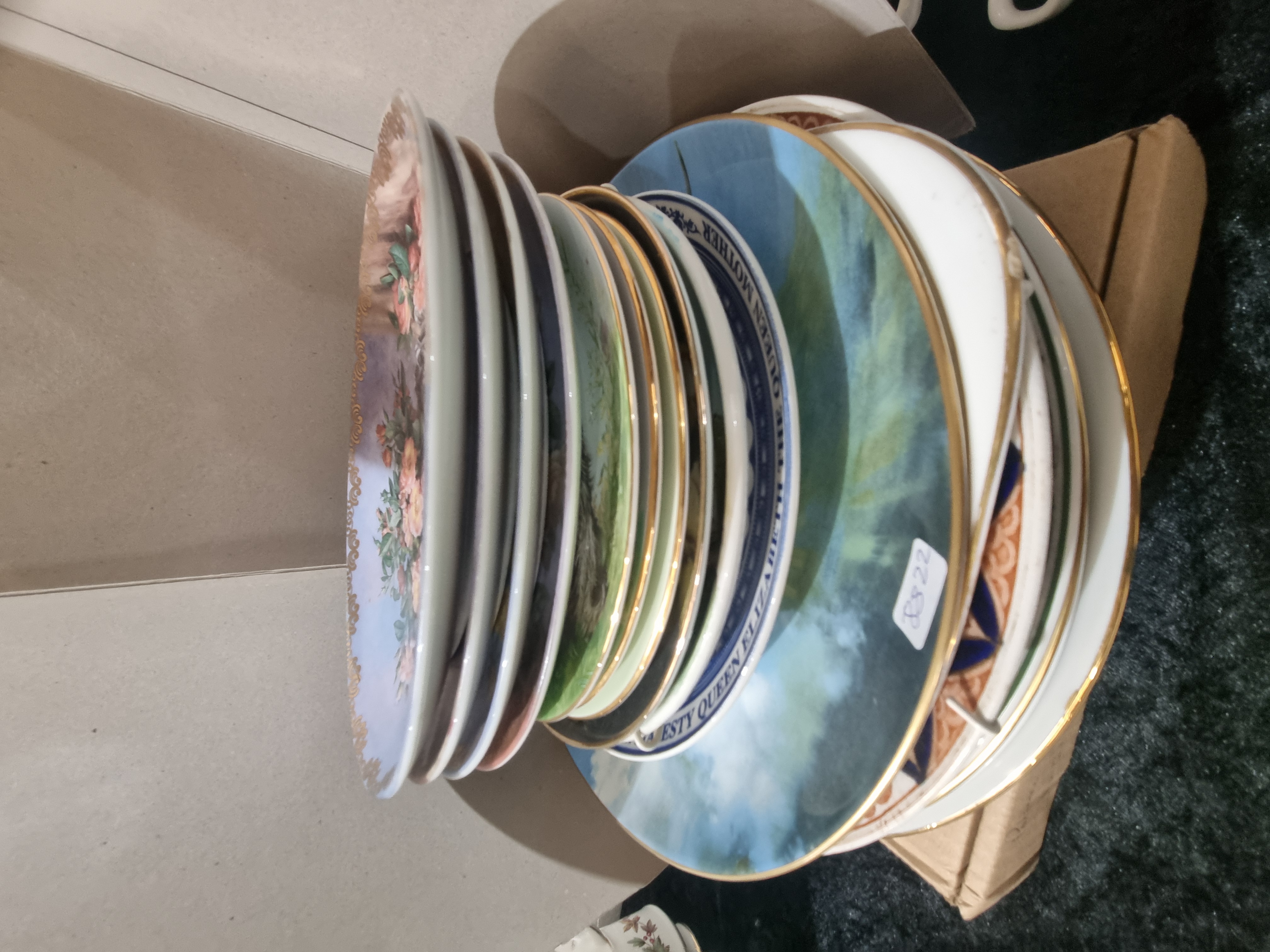 A collection of circular plates of various sizes, primarily constructed from porcelain or fine bone china. The lot includes a commemorative plate featuring a blue border with the printed inscription ELIZABETH THE QUEEN MOTHER. Other items in the collection feature transfer-printed decoration, including a plate with a floral arrangement on a pastel ground with a scalloped, gilded edge, and a large plate depicting a misty, impressionistic mountainous landscape. Additional plates show various pastoral and scenic views. Most pieces are finished with fine gilded rims. No factory marks are visible in the current arrangement, though one plate bears a small adhesive tag with the digits 8522.