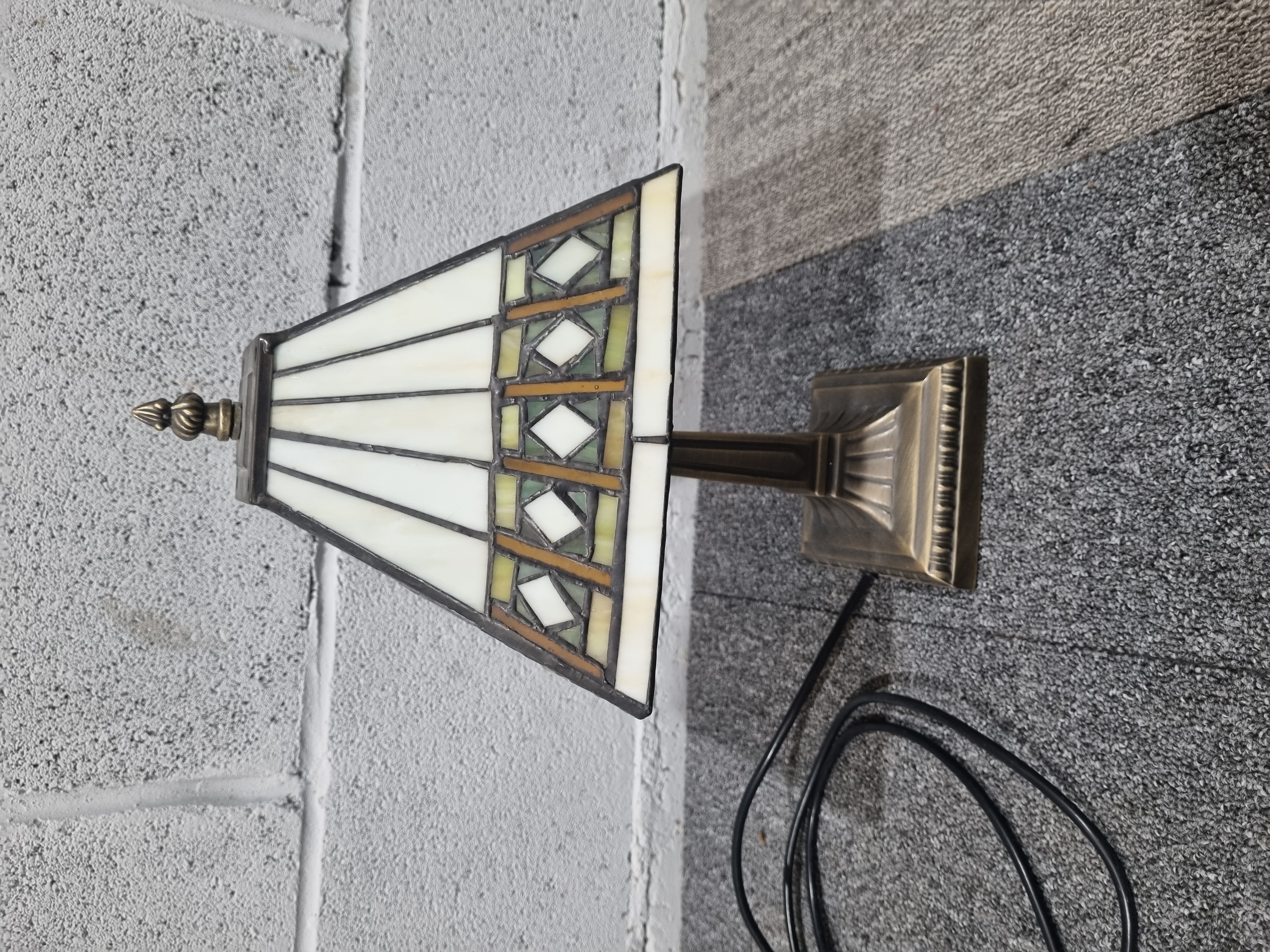 A table lamp in the Arts and Crafts Mission style featuring a four-sided leaded glass shade in the Diamond Band pattern. The shade is constructed with cream, green, and amber geometric glass panels and is surmounted by a decorative metal finial. The shade is supported by an antiqued bronze-finish metal base with a fluted pedestal and stepped, square foot. A black electrical power cord is attached. No maker’s marks or signatures are visible. This design is characteristic of the Diamond Band Mission pattern.