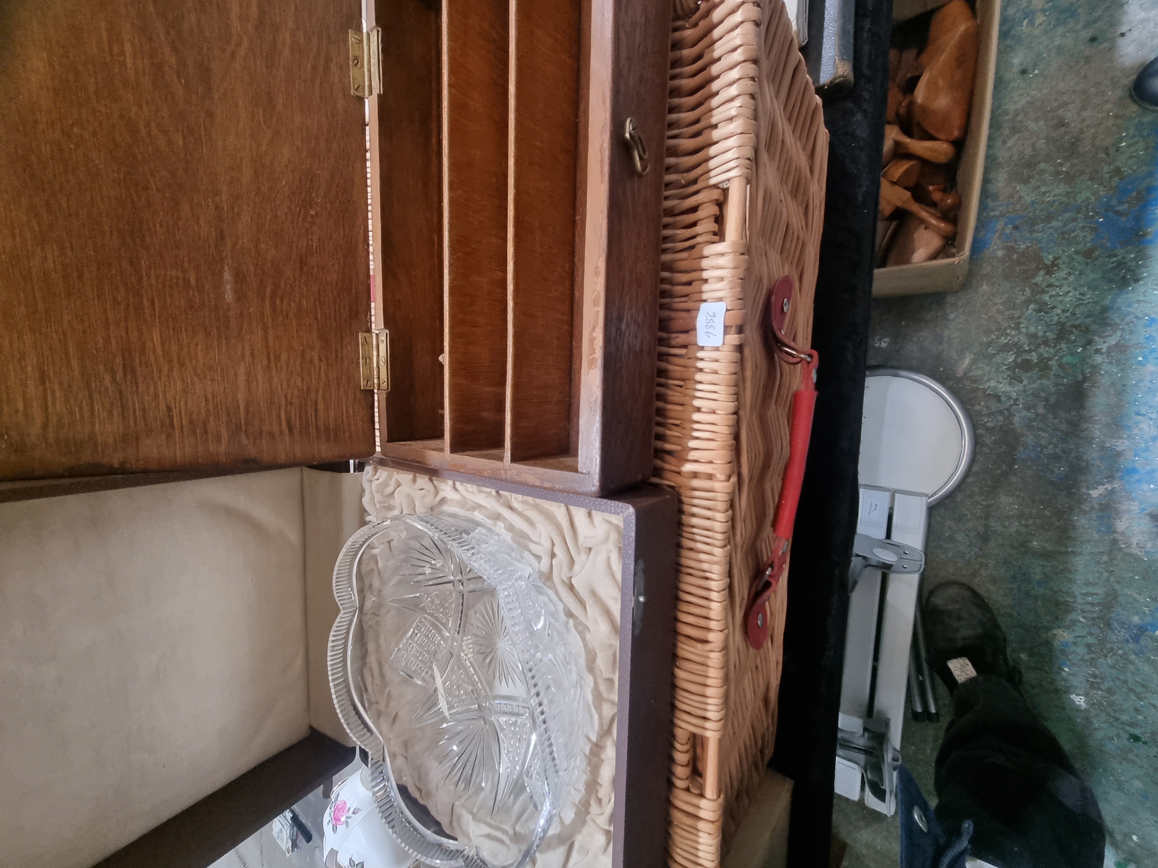An Assortment of Household and Decorative Items Including a Cut Crystal Presentation Bowl, a Wicker Picnic Hamper, and a Wooden Storage Box