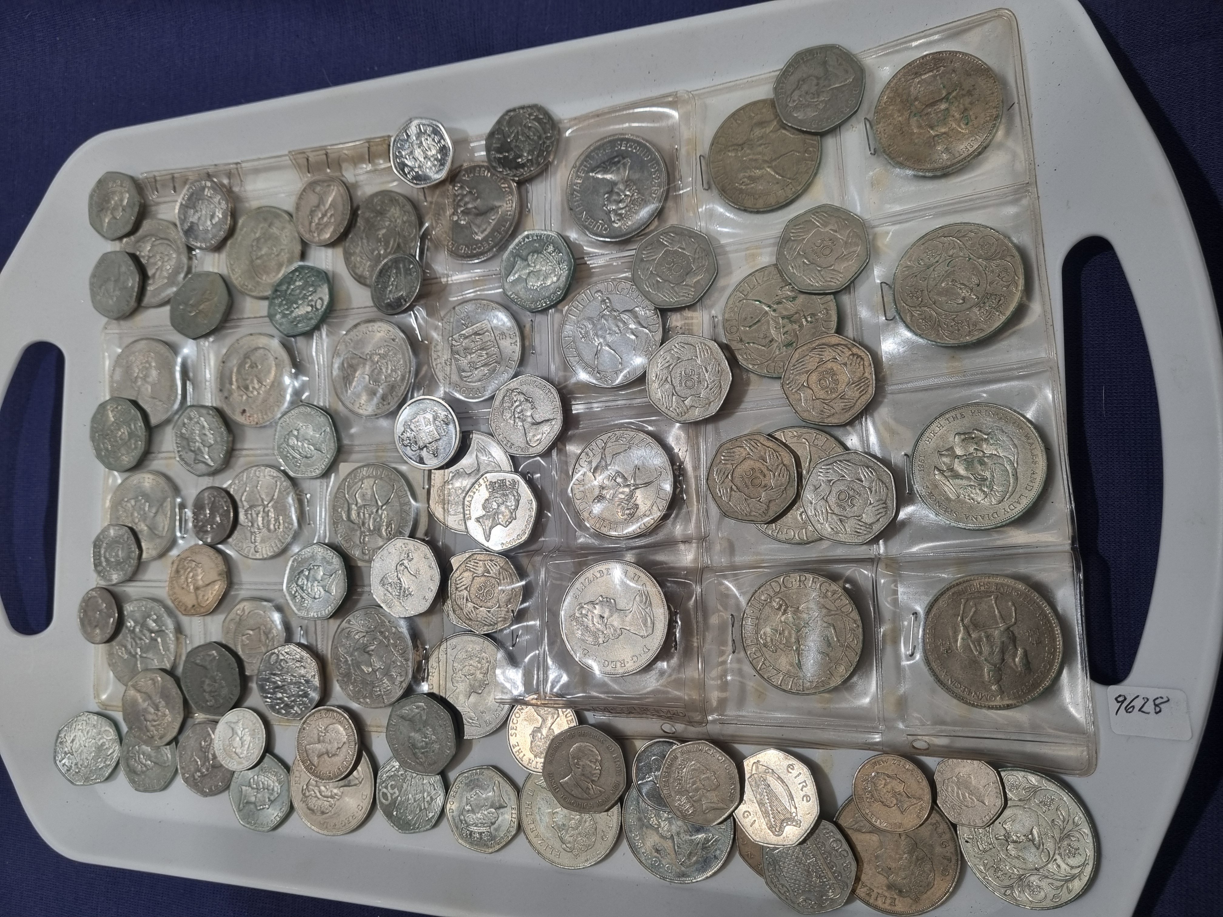 A collection of United Kingdom and Irish coins comprising various denominations and commemorative issues. The group includes several commemorative crowns, notably the 1965 Winston Churchill issue, the 1977 Silver Jubilee crown, and the 1981 Royal Wedding crown depicting the Prince of Wales and Lady Diana Spencer. Obverse designs feature portraits of British monarchs including Queen Victoria with the transcription VICTORIA DEI GRA BRITT REGINA FID DEF IND IMP, King George VI inscribed GEORGIVS VI D G BR OMN REX, and Queen Elizabeth II inscribed ELIZABETH II D G REG F D. The collection contains multiple heptagonal fifty pence pieces, including the 1973 European Economic Community commemorative and early New Pence versions. An Irish decimal coin featuring a harp and the inscription eire 1971 is present. Other denominations include ten pence, five pence, two pence, and one penny coins. Metal compositions include cupro-nickel and bronze, with potential silver content in older or commemorative issues. Several coins are held in individual plastic sleeves. The collection is presented on a white plastic tray with an adhesive label marked 9628.
