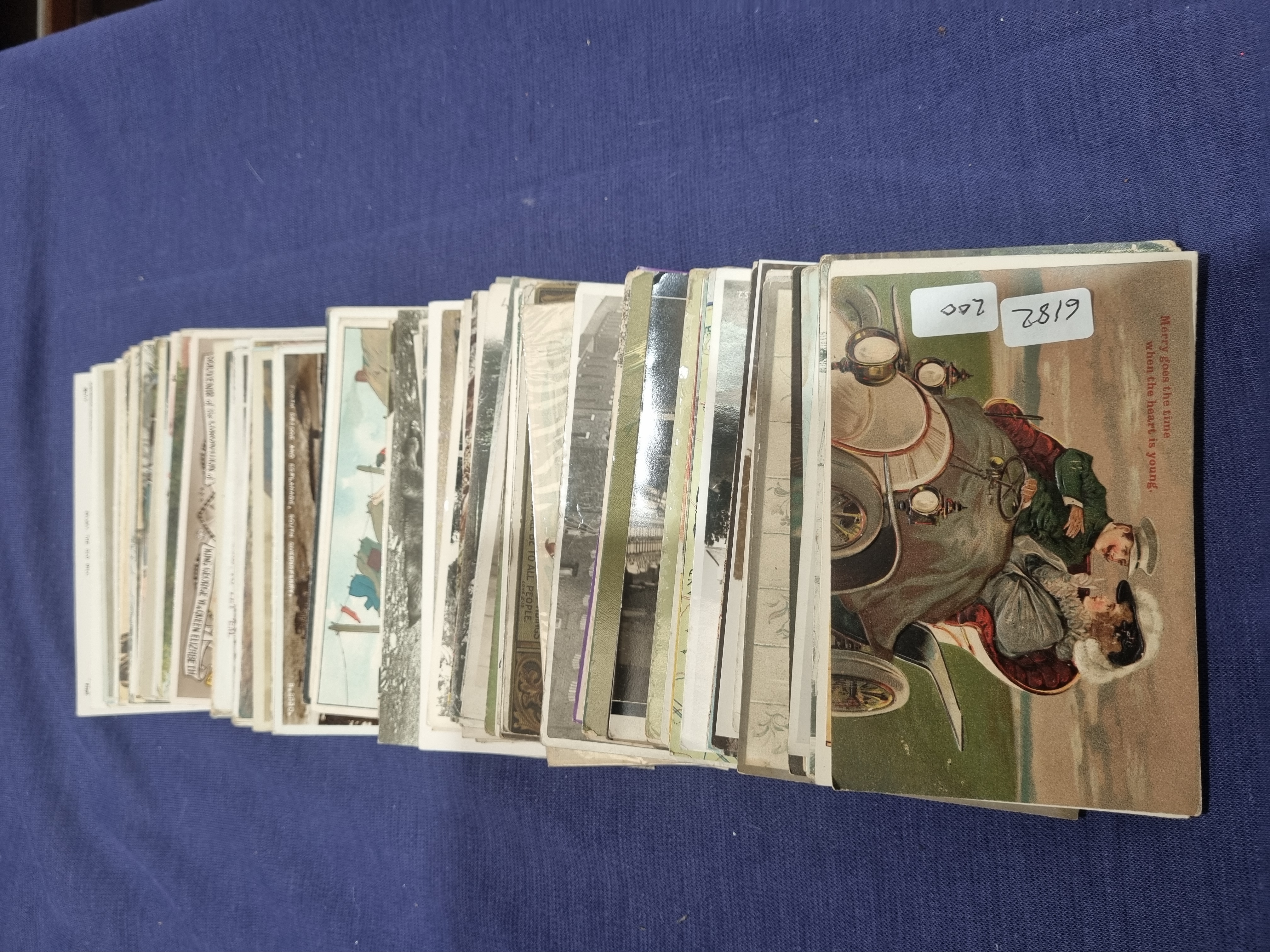 This collection of vintage postcards and paper ephemera dates primarily from the early to mid-20th century. The assortment includes a variety of printed subjects such as topographical views, architectural scenes, and genre illustrations. Notable identified items within the stack include a colour illustrated card depicting a couple in an early motor car with the caption Merry goes the time when the heart is young. Also present is a topographical view titled FORTH BRIDGE AND ESPLANADE, SOUTH QUEENSFERRY and a royal commemorative postcard titled SOUVENIR of the CORONATION of KING GEORGE VI & QUEEN ELIZABETH dating to 1937. The collection features a mix of landscape and architectural subjects with a primary focus on the United Kingdom. The cards appear to be printed lithographic or halftone examples. Two adhesive auction labels with the numbers 200 and 6182 are attached to the uppermost card.