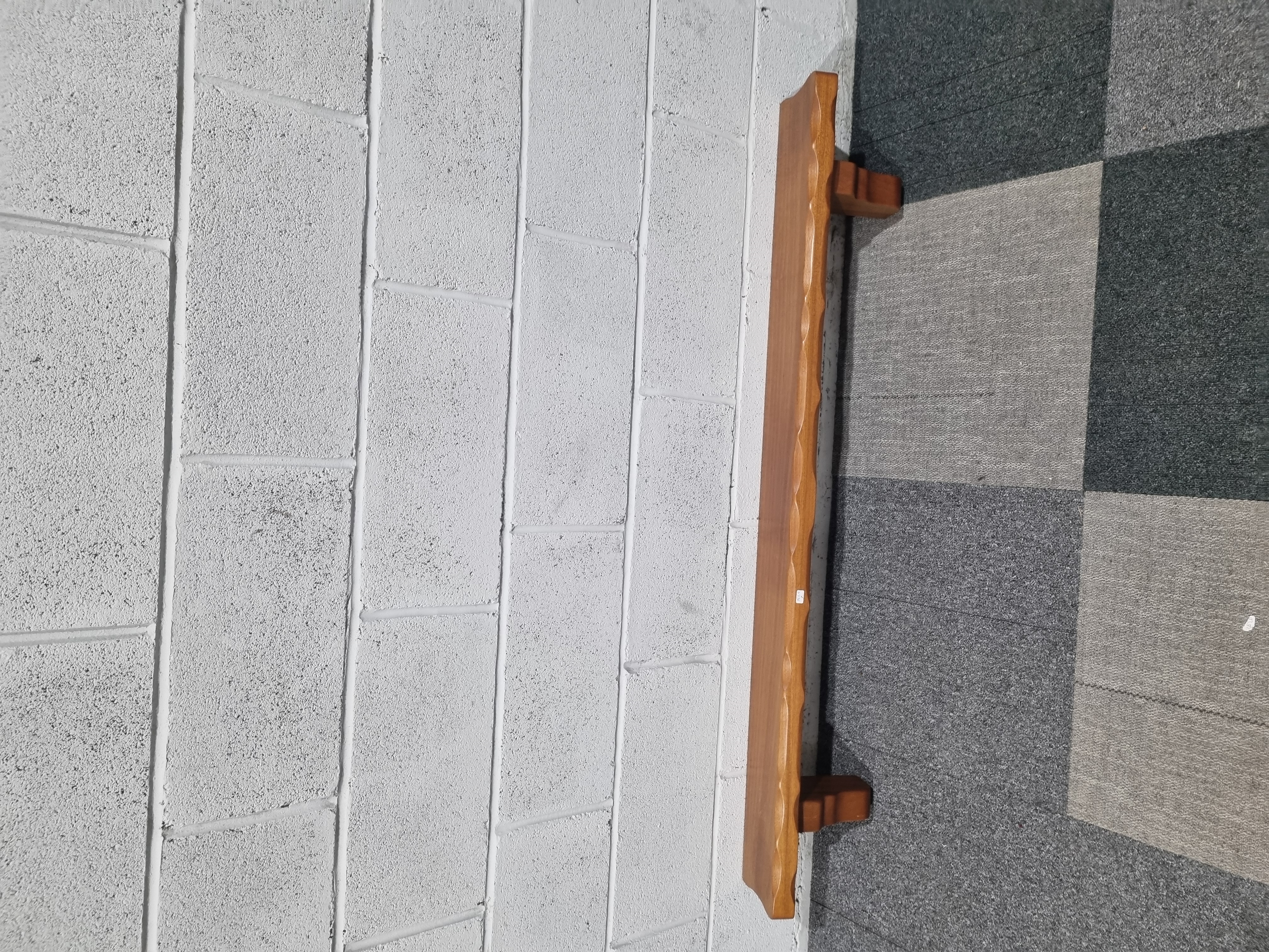 A wall-mounted shelf or mantel piece of solid oak construction with a medium-brown polished finish. The rectangular shelf features a hand-tooled adzed or scalloped front edge with an undulating texture. The structure is supported by two integral rectangular brackets. A small white adhesive label is adhered to the front edge with indistinct characters. No maker’s marks or signatures are visible.