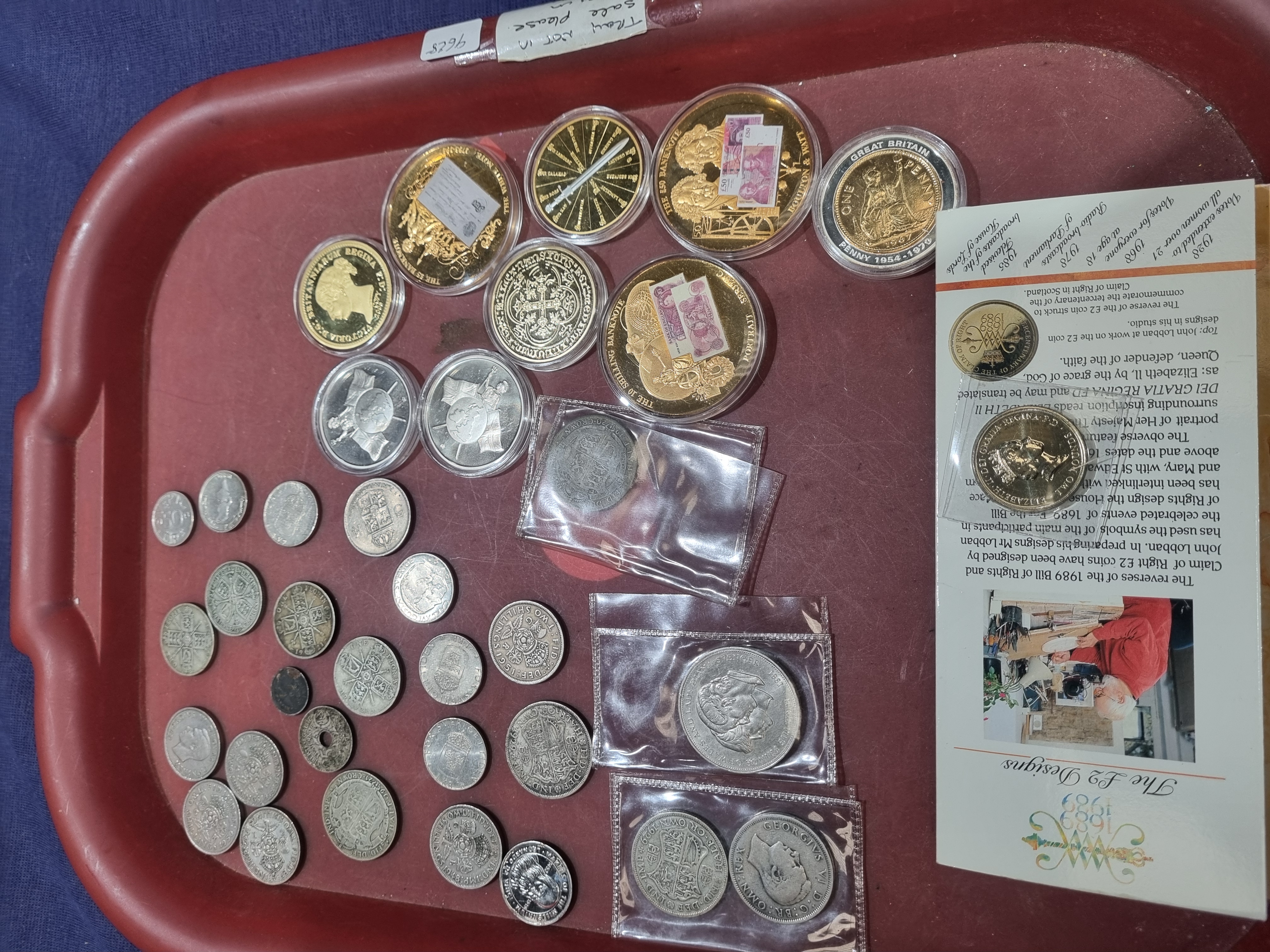 A collection of British numismatic items comprising currency and commemorative medals. The lot includes a significant portion of prec1947 coinage, featuring silver-coloured denominations such as crowns, florins, shillings, and sixpences. Notable monarchs represented include Queen Victoria, with a silver crown bearing the inscription VICTORIA D: G: BRITT: REG: F: D:, and King George V, identified by the legend GEORGIVS V D G BR OMN REX F D IND IMP. The collection also contains several gilt or gold-coloured commemorative medals, including pieces dedicated to the Boulton & Watt engineering partnership, the 10 Shilling Banknote, and the £50 Banknote. A 1989 commemorative £2 coin celebrating the Tercentenary of the Bill of Rights is present with its original descriptive card. Reverse designs across the group include the Royal Arms, heraldic shields, seated Britannia, and cruciform shields. The items are housed in various formats, including loose, in plastic capsules, and within protective sleeves.