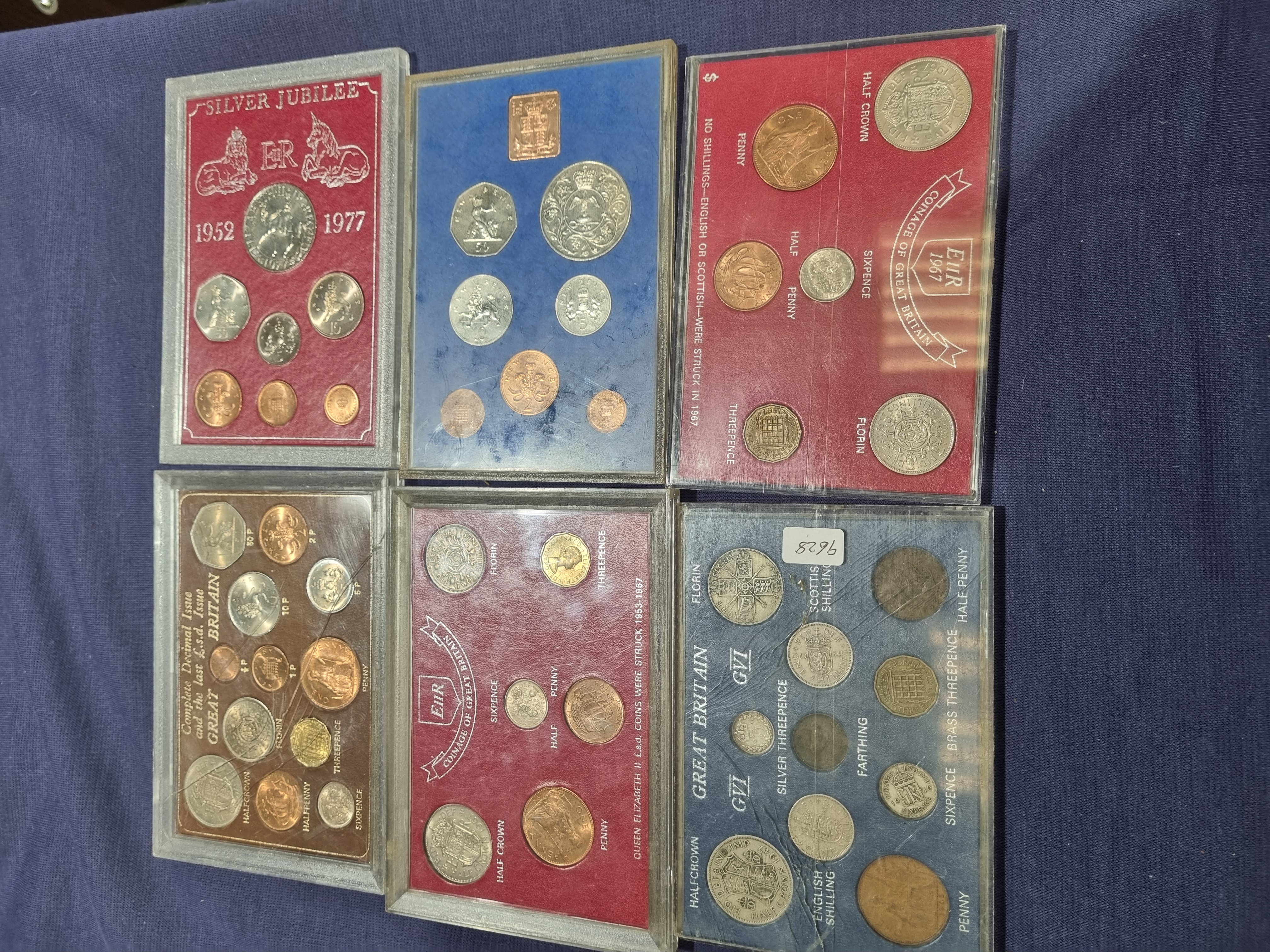 A collection of United Kingdom numismatic sets housed in individual plastic presentation cases. The collection includes a Silver Jubilee 1952-1977 commemorative set containing a 25p crown and early decimal coinage; two 1967 Coinage of Great Britain pre-decimal sets; a combined Complete Decimal Issue and the last £.s.d. Issue set; a King George VI era set; and a Queen Elizabeth II pre-decimal set. The coins are struck in cupro-nickel, bronze, and brass alloys. Denominations include crowns, halfcrowns, florins, English and Scottish shillings, sixpences, brass and silver threepences, pennies, halfpennies, farthings, and various decimal pence. The cases are printed with descriptive titles and denomination labels. These sets were issued to commemorate the 1971 decimalisation and the 1977 Silver Jubilee.