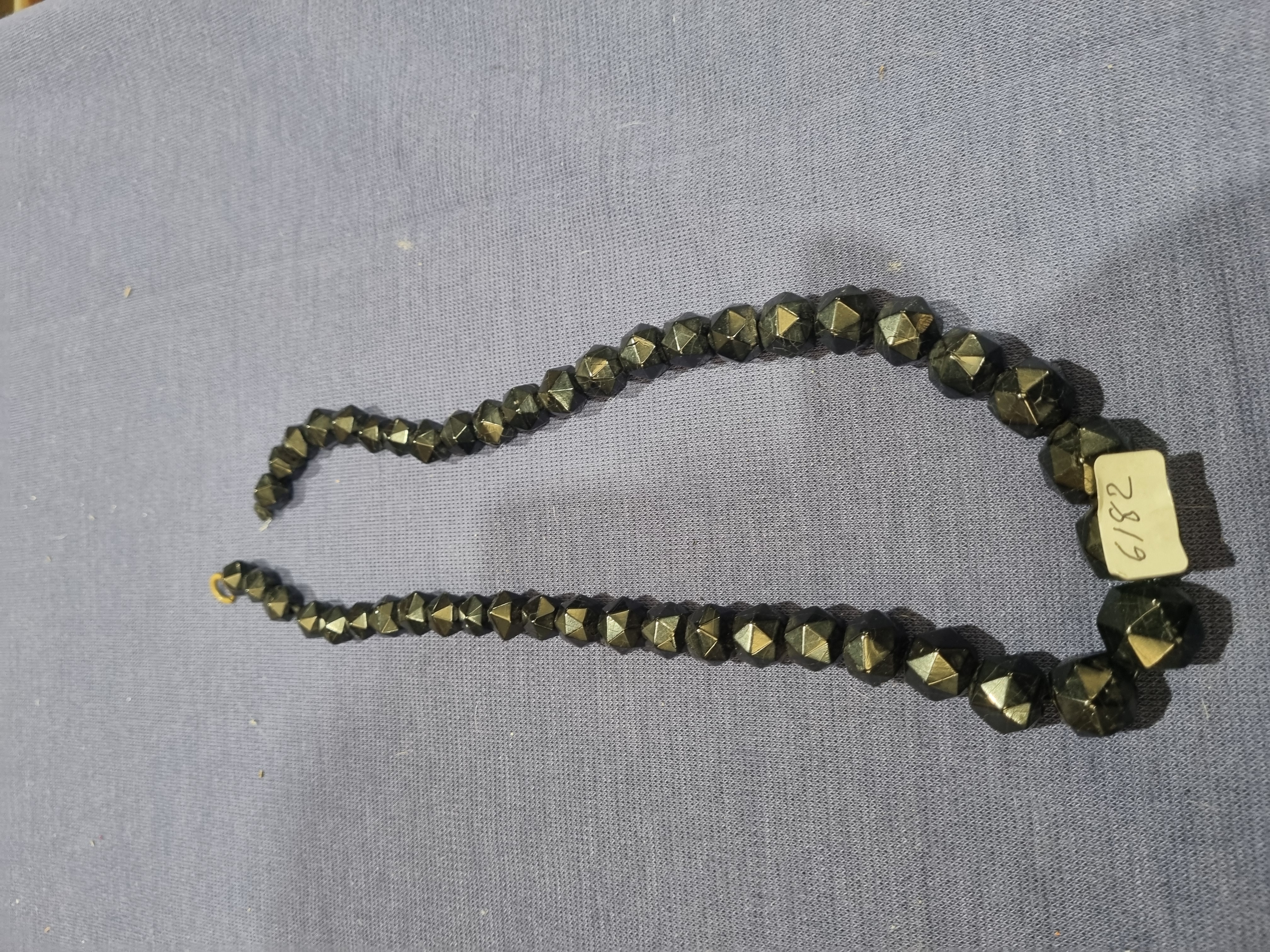 A single strand jet necklace featuring graduated, faceted beads. The beads are constructed from a dark base material, likely black glass known as French jet, with geometric multi-faceted cuts. Many facets exhibit a metallic, bronze-toned surface treatment. The beads are strung on a flexible cord. The piece terminates in a yellow-toned metal loop. No maker’s marks or hallmarks are present.