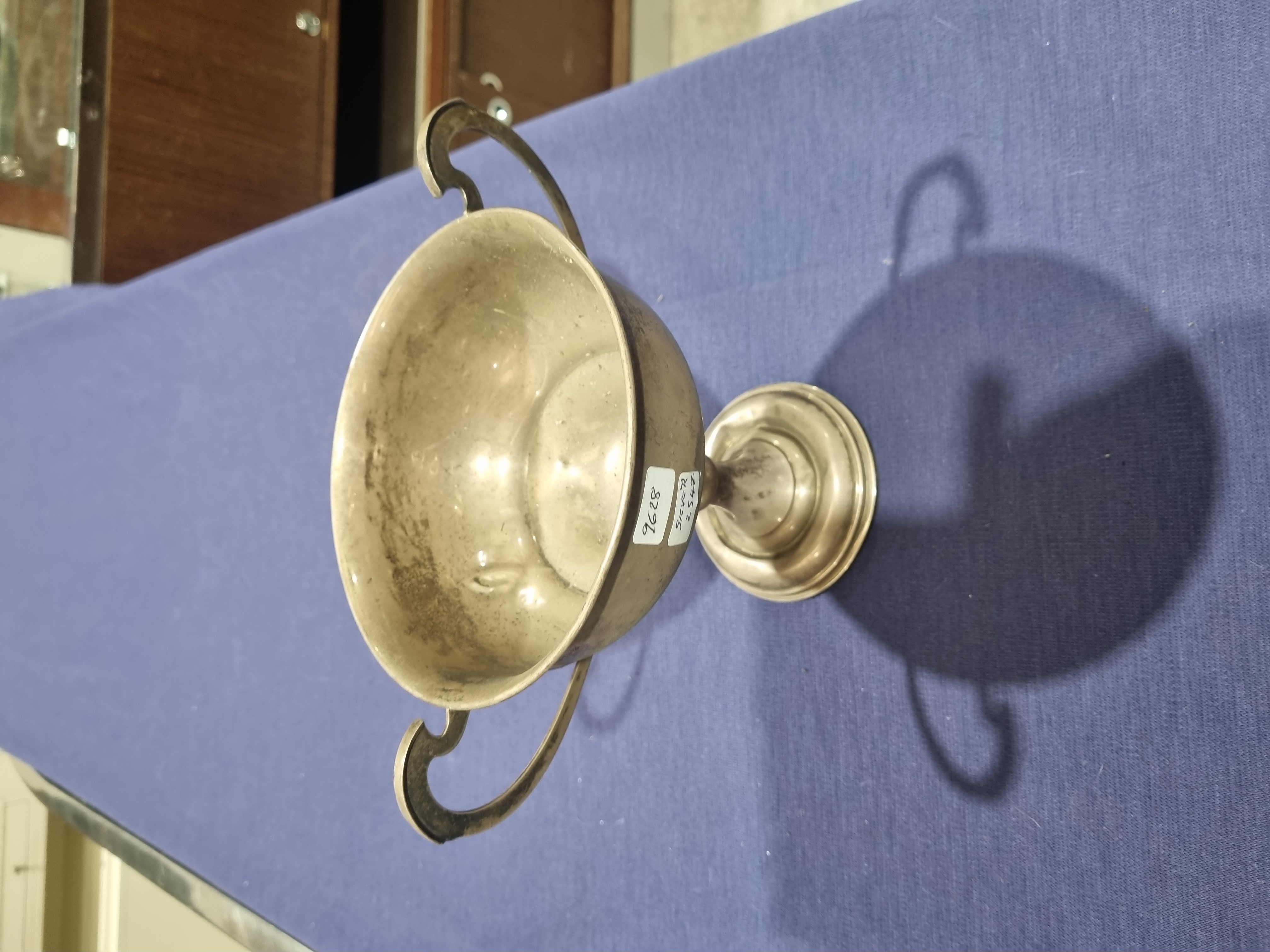 A George V sterling silver twin-handled pedestal bowl featuring a deep circular vessel with two stylized scrolling handles. The piece is mounted on a pedestal stem and a stepped circular foot. The body bears a series of hallmarks including the maker’s mark R.C.D, the lion passant for sterling silver, the anchor for the Birmingham assay office, and the capital letter Z date mark. Two adhesive auction labels are present on the exterior, one of which is inscribed with the weight.