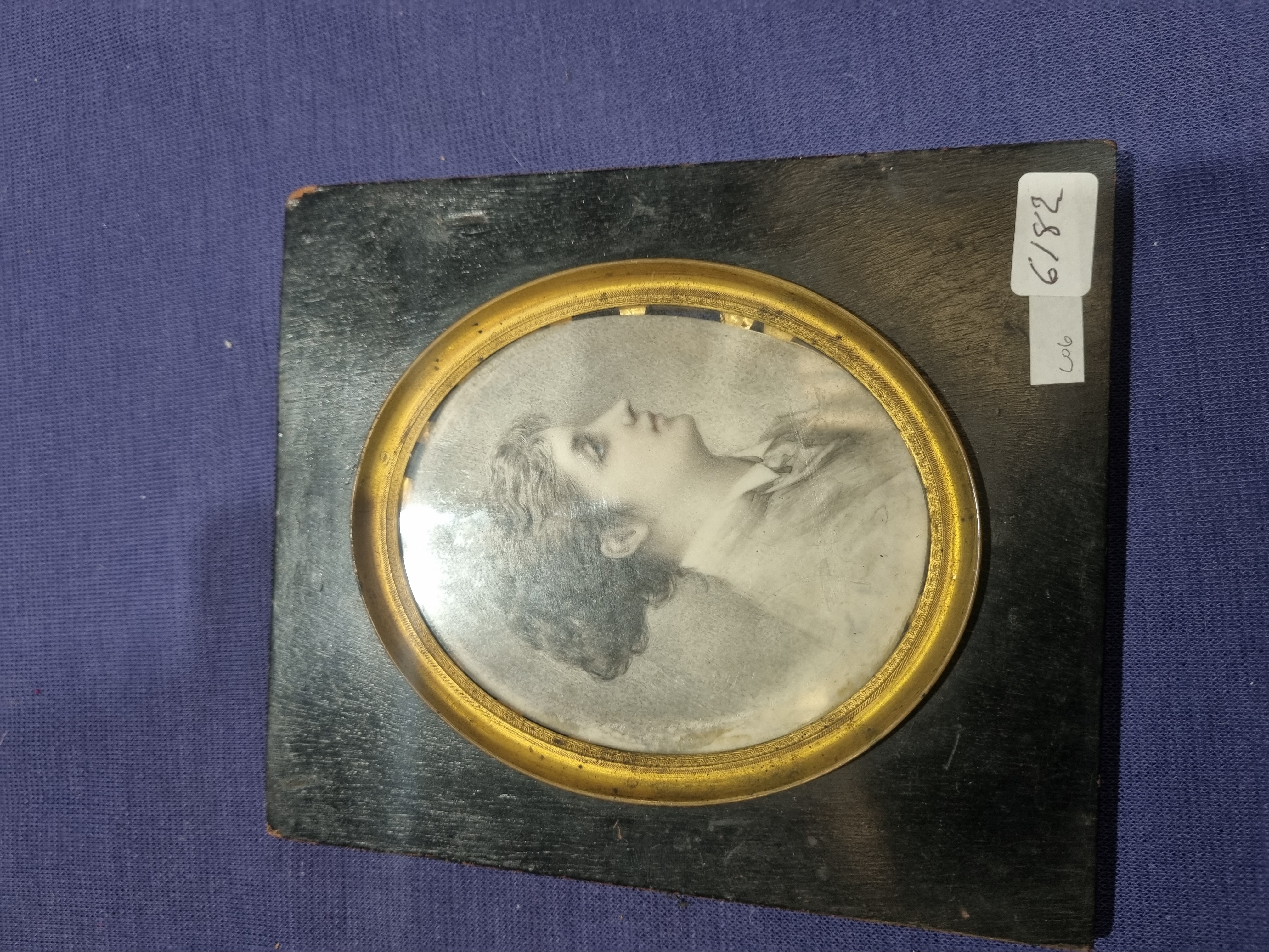Attributed to Cameo Creation, this monochromatic portrait print, possibly a silver gelatin print, depicts a woman in profile with her gaze directed upwards. The image is presented in an oval format behind glass, housed within a decorative gilt metal slip featuring a repeating geometric border. This assembly is mounted onto a square black wooden plaque. The presentation is characteristic of mid-20th-century decorative portraiture. Faint, illegible characters are visible at the top edge of the image within the aperture. The wooden mount features two white adhesive inventory stickers with the handwritten notations 6182 and L06. No definitive maker marks or artist signatures are visible.