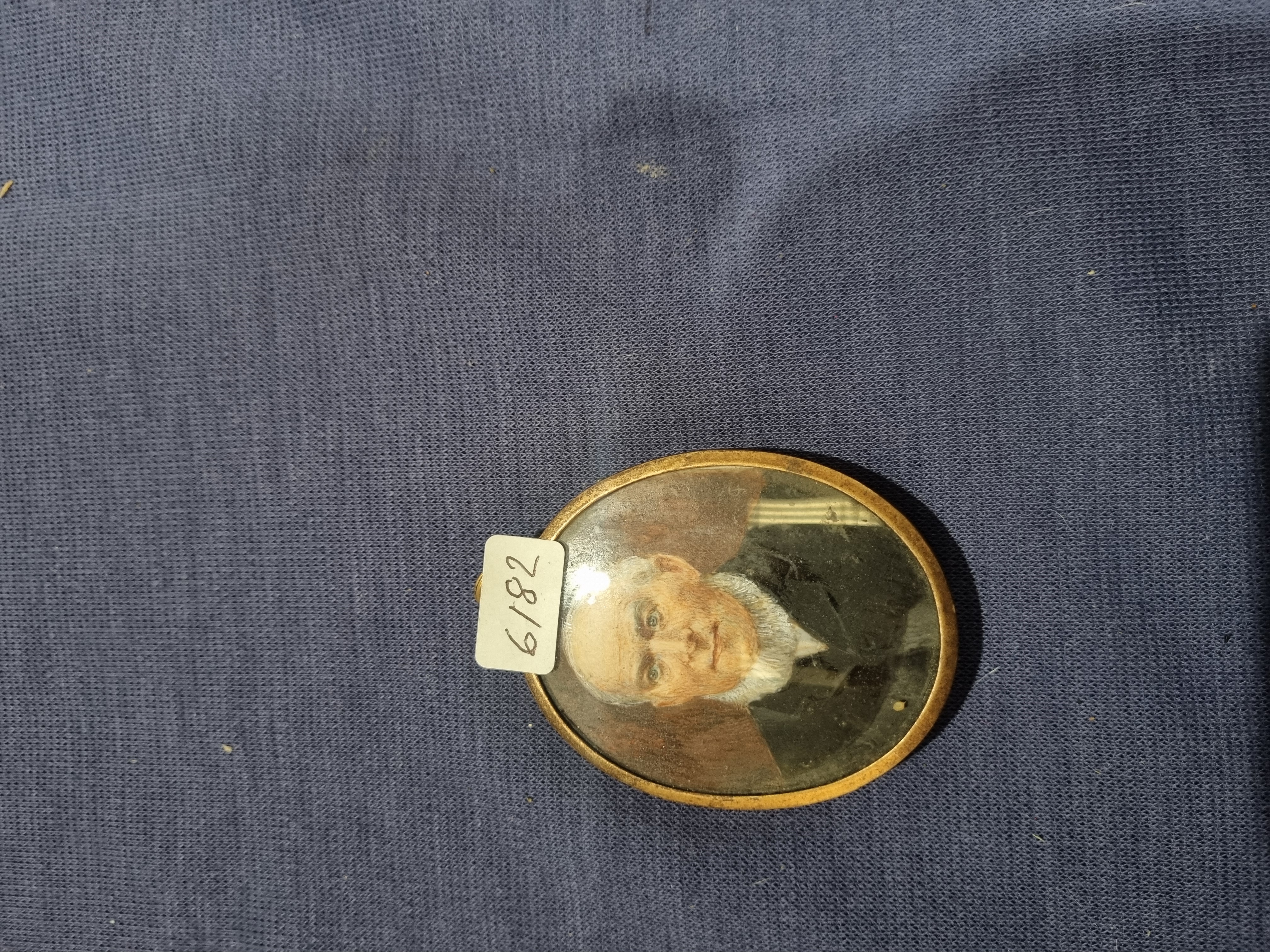 An oval portrait miniature featuring a head-and-shoulders study of an elderly gentleman. The subject is depicted with a white beard and balding pate, dressed in a dark jacket and white shirt. The artwork is a photographic print, possibly with hand-coloured details, presented under a domed glass cover. It is housed in a simple gold-toned metal oval pendant frame featuring a small suspension loop at the top. A white adhesive inventory label is affixed to the glass, upon which are handwritten the numerals 6182. There are no visible signatures, dates, or other inscriptions on the face of the item.