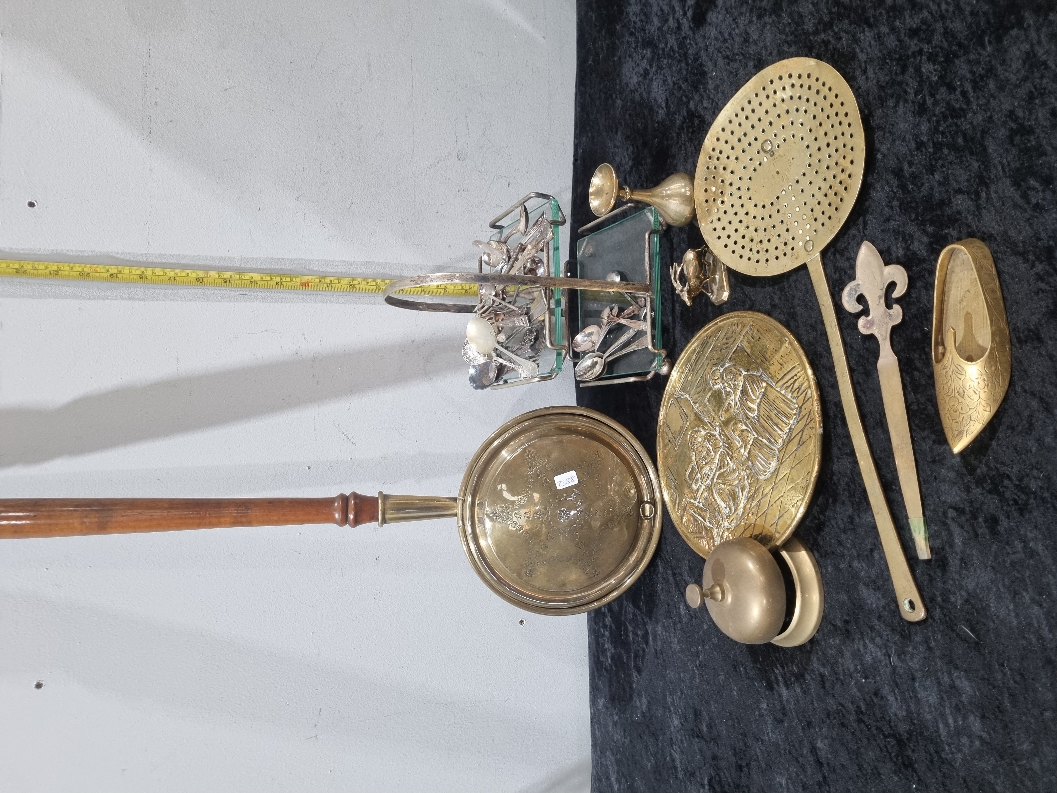 This collection is led by a nineteenth-century brass bed warming pan featuring an embossed floral and scrollwork lid and a turned wooden handle. The assortment includes a variety of traditional English domestic metalware, such as a large brass kitchen skimmer with a pierced circular head and a long cast handle. Also present is a circular brass wall plaque with embossed decoration depicting a genre scene of figures in a domestic setting. The lot further contains a mechanical tapper-style desk bell, a cast brass ornamental slipper with incised foliate patterns, and a decorative item with a fleur-de-lis terminal. Miniature items include a small brass vessel and a cast figurine of a seated stag. Completing the collection is a two-tier metal stand with glass inserts, containing approximately twelve silver-plated teaspoons. The stand appears to be silver-plated or chrome-plated. No maker’s marks are visible on the items. A white adhesive label with the numerals 8, 8, 2, 2 is present on the warming pan lid.
