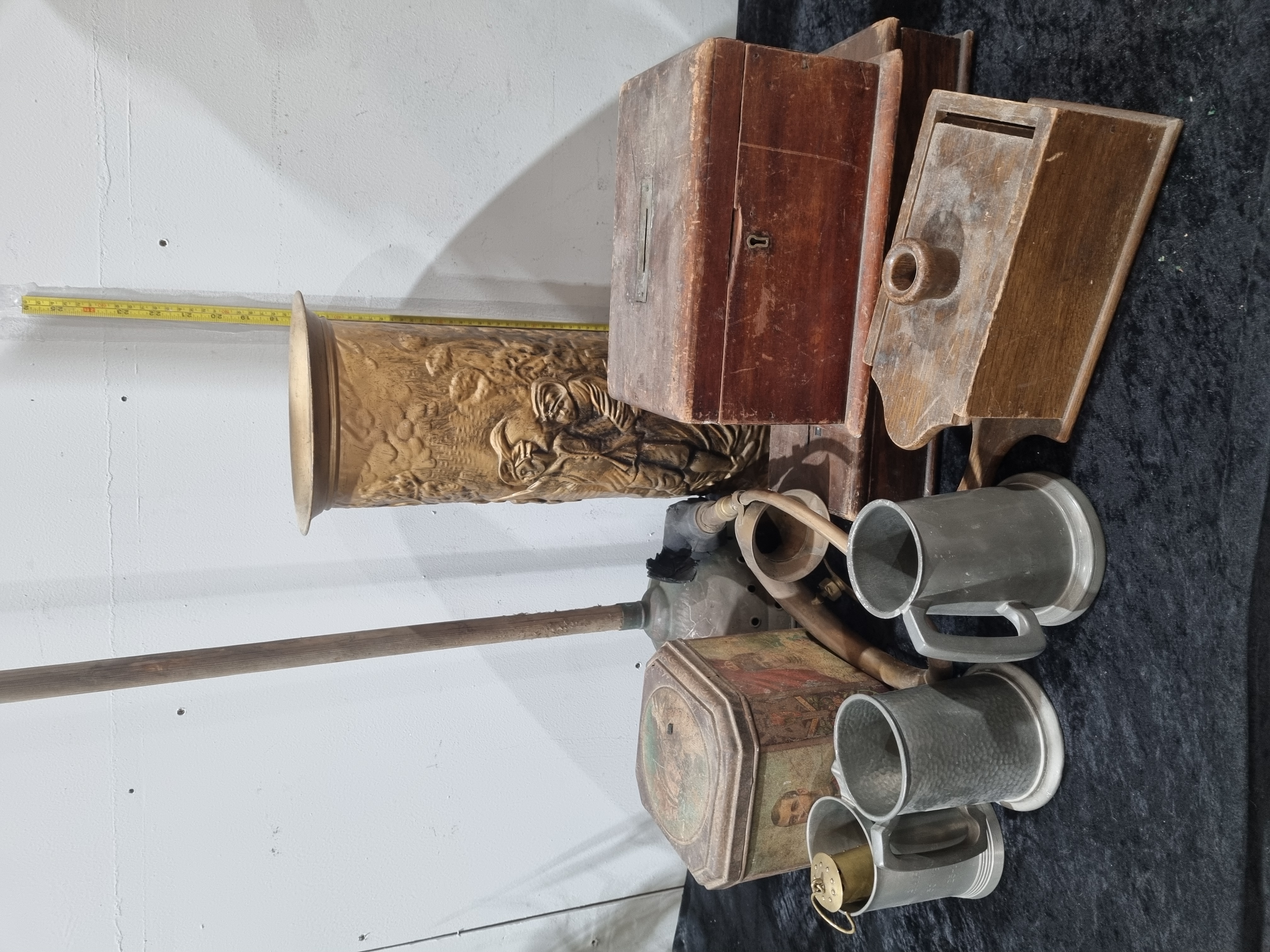 This collection comprises a variety of 19th and early 20th-century domestic wares. The group includes a cylindrical brass umbrella stand with a flared rim, decorated with an embossed repousse scene depicting figures in historical costume within a tavern or domestic interior. Also present is a group of pewter tankards, including one example with a hammered body and others of cast construction. The wooden items consist of a rectangular mahogany-toned box with a hinged lid and metal escutcheon, and a smaller wooden chest with a single drawer and wooden pull-handle. The lot is completed by a hexagonal tin with lithographed scenes and a long-handled domestic tool with a turned wooden handle and metal end. No maker marks or hallmarks are visible on the items.