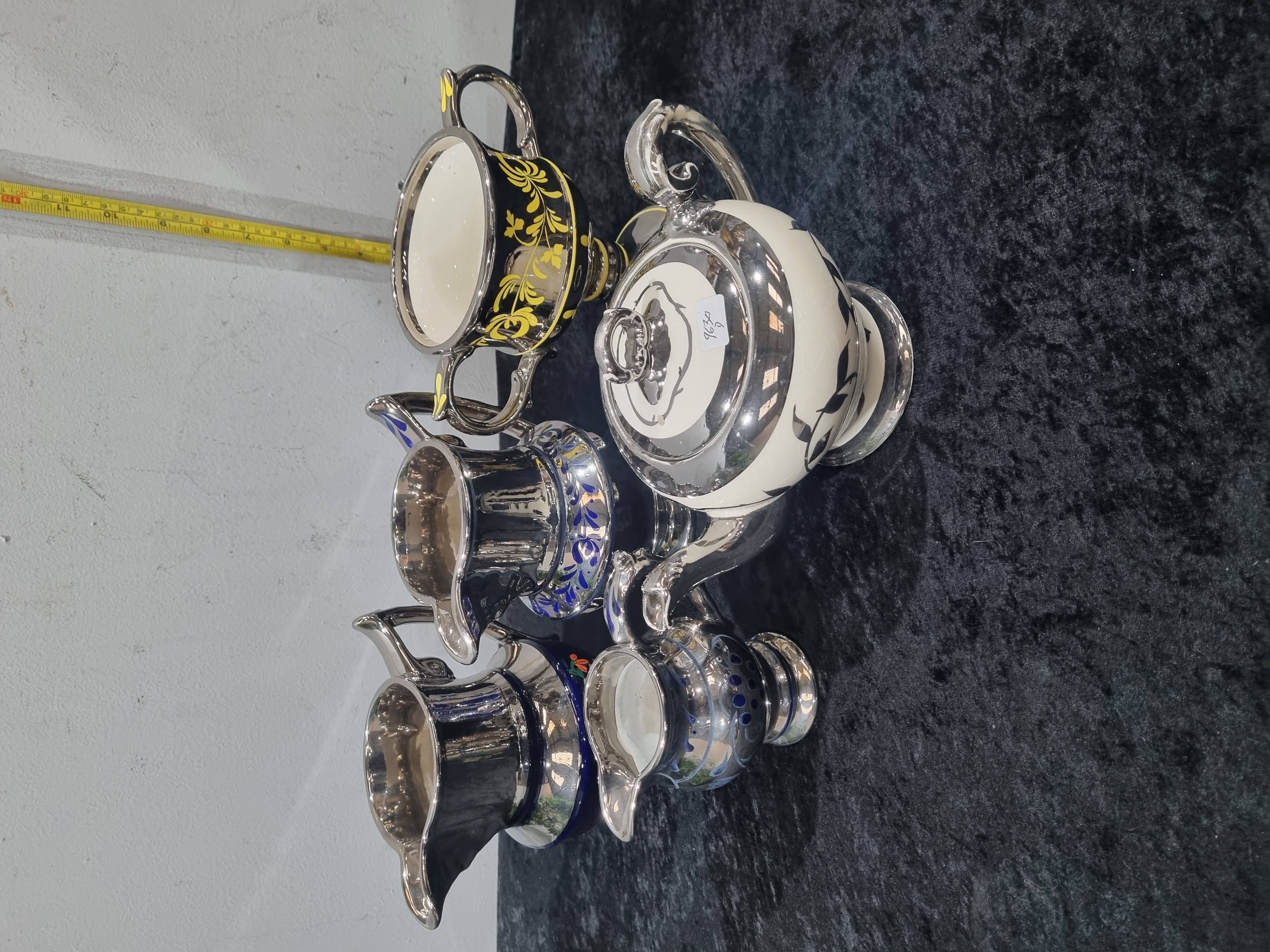 A collection of five decorative ceramic items featuring silvered finishes, characteristic of early 20th-century British art pottery. The group includes a globular teapot with a cream-coloured earthenware body, decorated with dark, branch-like foliate motifs and finished with a reflective silvered lid, handle, spout, and upper rim. Also included is a two-handled sugar bowl featuring a wide black exterior band with a yellow scrolling foliate pattern and a silvered interior and handles. The collection is completed by three jugs of varying forms, each with a silvered exterior and hand-painted floral decoration to the base, including blue and polychrome motifs. A small white adhesive label with the handwritten number 9630 is present on the teapot lid. No factory marks are visible on the bases or bodies of the items.
