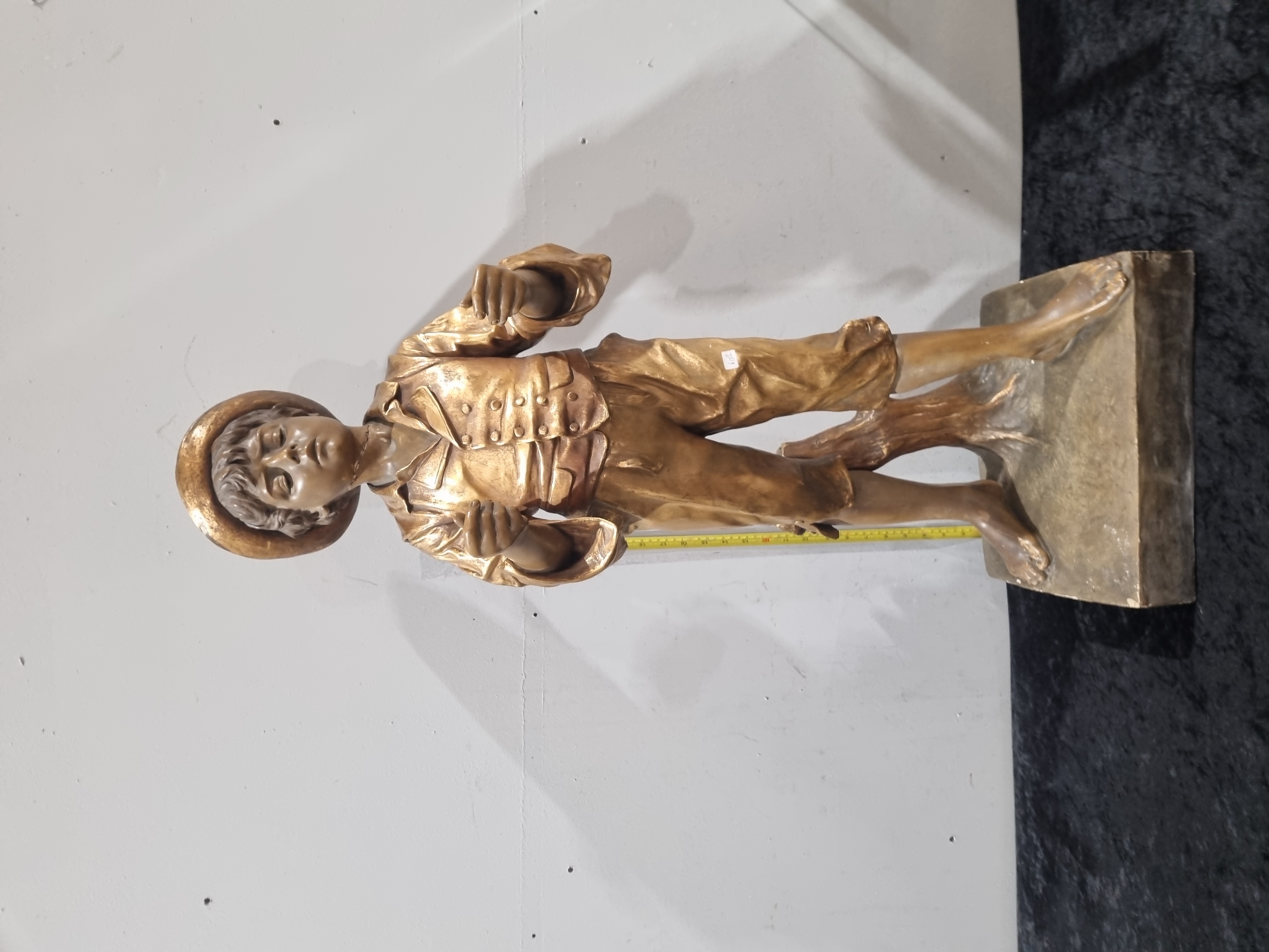 This sculpture is a patinated plaster figure of a young boy, executed in a realist genre style. The figure is depicted barefoot, wearing a wide-brimmed hat, a double-breasted waistcoat with textured buttons over a collared shirt, and knee-length breeches. The hands are positioned in a manner suggesting the figure may have originally held an object, such as a cigarette, which is consistent with similar genre figures of the period. The work is finished with a golden-bronze tone patina to simulate the appearance of cast metal and is set upon an integral, textured rectangular plinth base. No signatures, foundry marks, or edition numbers are visible on the base or body of the piece. The style and subject matter resemble genre figures produced by makers such as Friedrich Goldscheider or Jose Cardona.