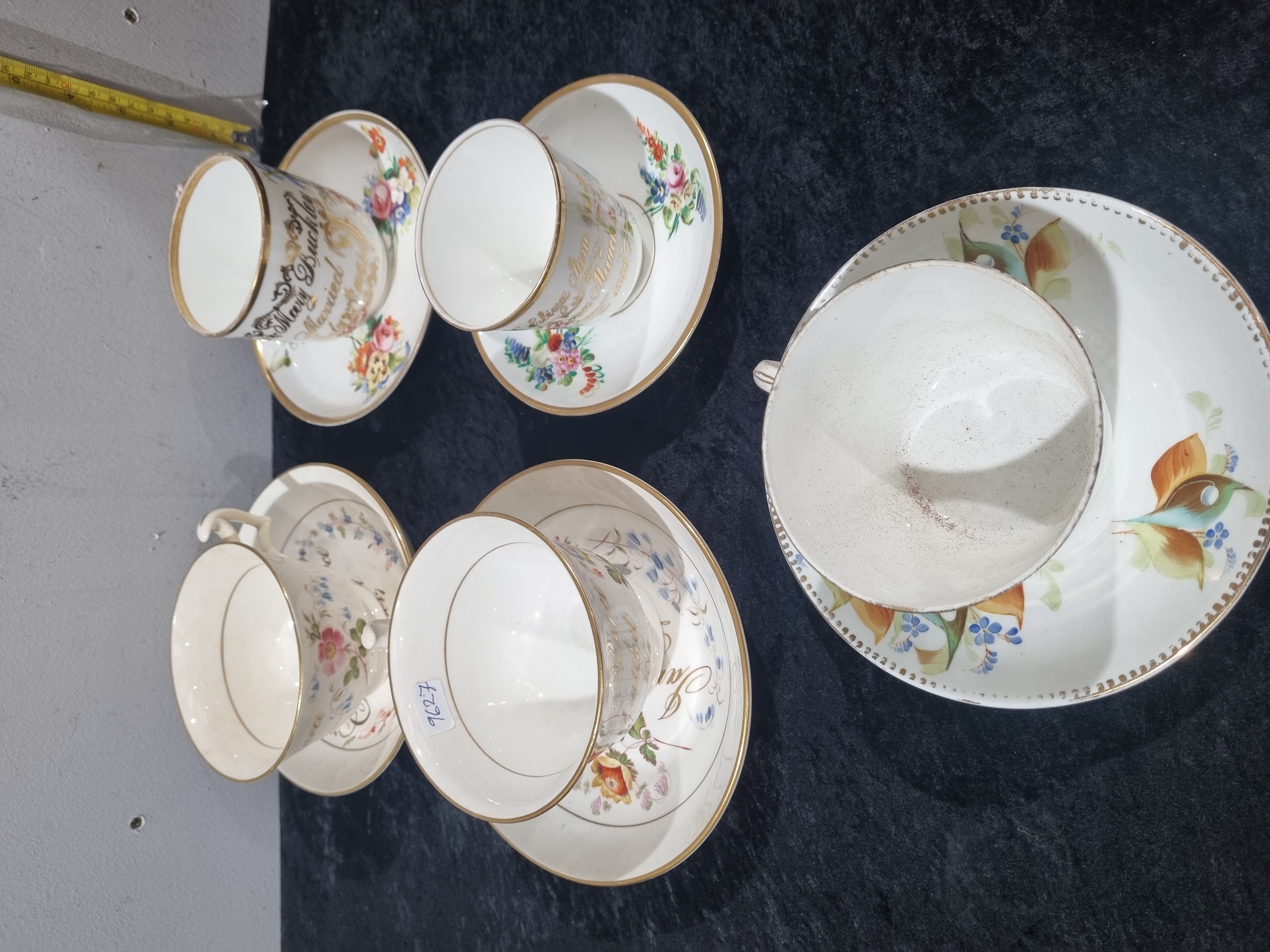 A collection of porcelain tea cups and matching saucers, in the style of 19th-century English bone china. The items are constructed from bone china and feature various transfer-printed and hand-painted floral motifs. The forms include standard tea cups with scroll handles and matching circular saucers. One cup features a hand-gilded cursive inscription reading Mary Buckley Married followed by an obscured date, indicating a commemorative or presentation origin. The pieces are finished with hand-gilded rims and decorative accents. No factory marks or maker symbols are visible on the undersides of the pieces.