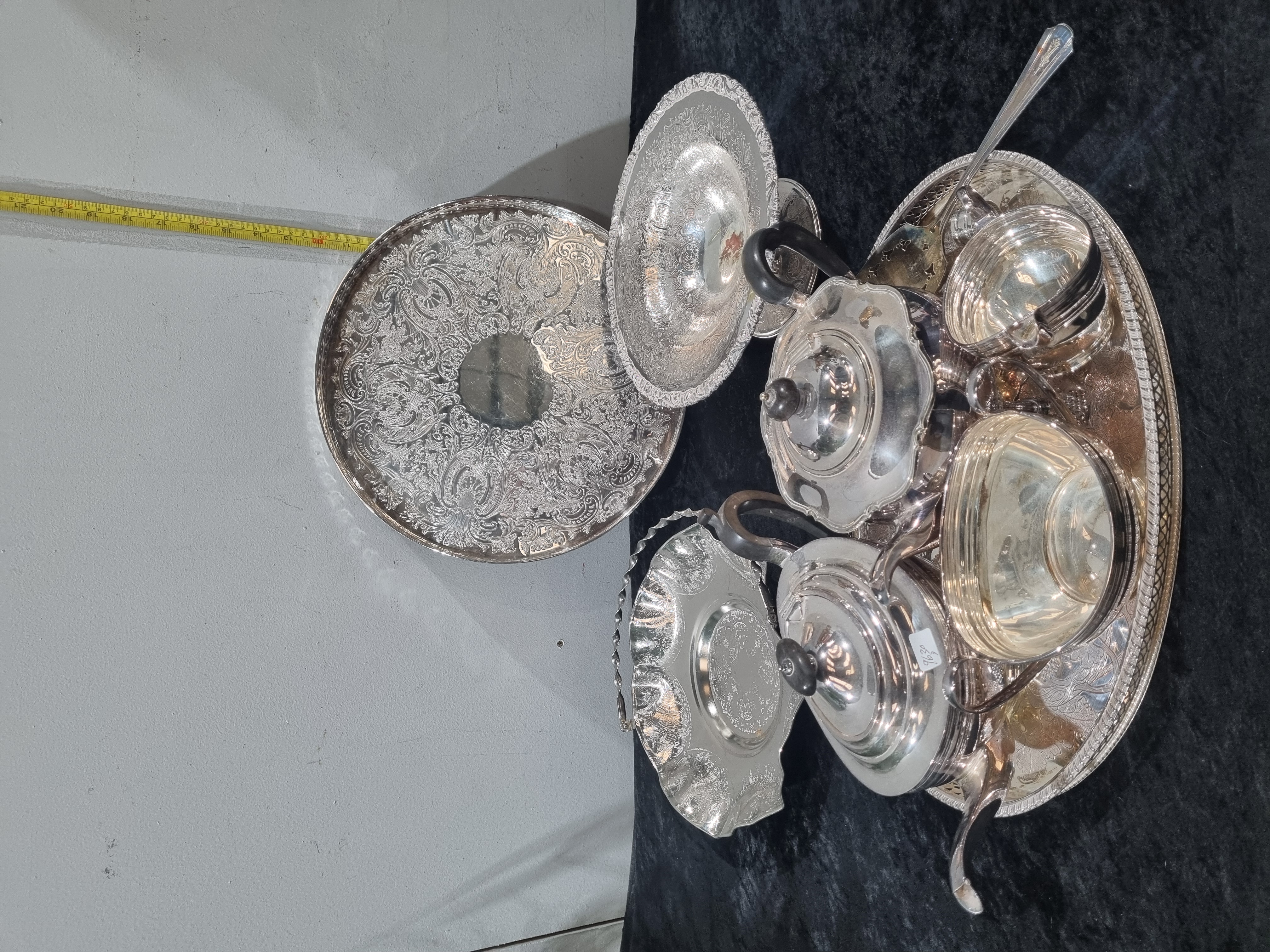 An assortment of silver-plated tablewares and decorative items in the late Victorian and Edwardian styles. The collection includes a four-piece tea and coffee service comprising a teapot, a tall coffee pot, a two-handled open sugar bowl, and a cream jug. These pieces feature lobed bodies, gadrooned rims, and scrolling handles, with the pots fitted with heat insulators. The service is presented on a large oval twin-handled tray with a decorative cast border and an engraved ground. Also included is a large circular salver featuring a heavily engraved ground with scrolling foliate and floral motifs surrounding a plain central reserve, finished with a gadrooned border. The collection further contains a circular pedestal bowl with a flared rim embossed and chased with floral and scroll designs, a lobed swing-handle basket with chased foliate decoration and a twisted handle, and a large soup or punch ladle in the Fiddle pattern. A small white adhesive lot label numbered 9630 is attached to the coffee pot. No maker’s marks or hallmarks are visible on the items.