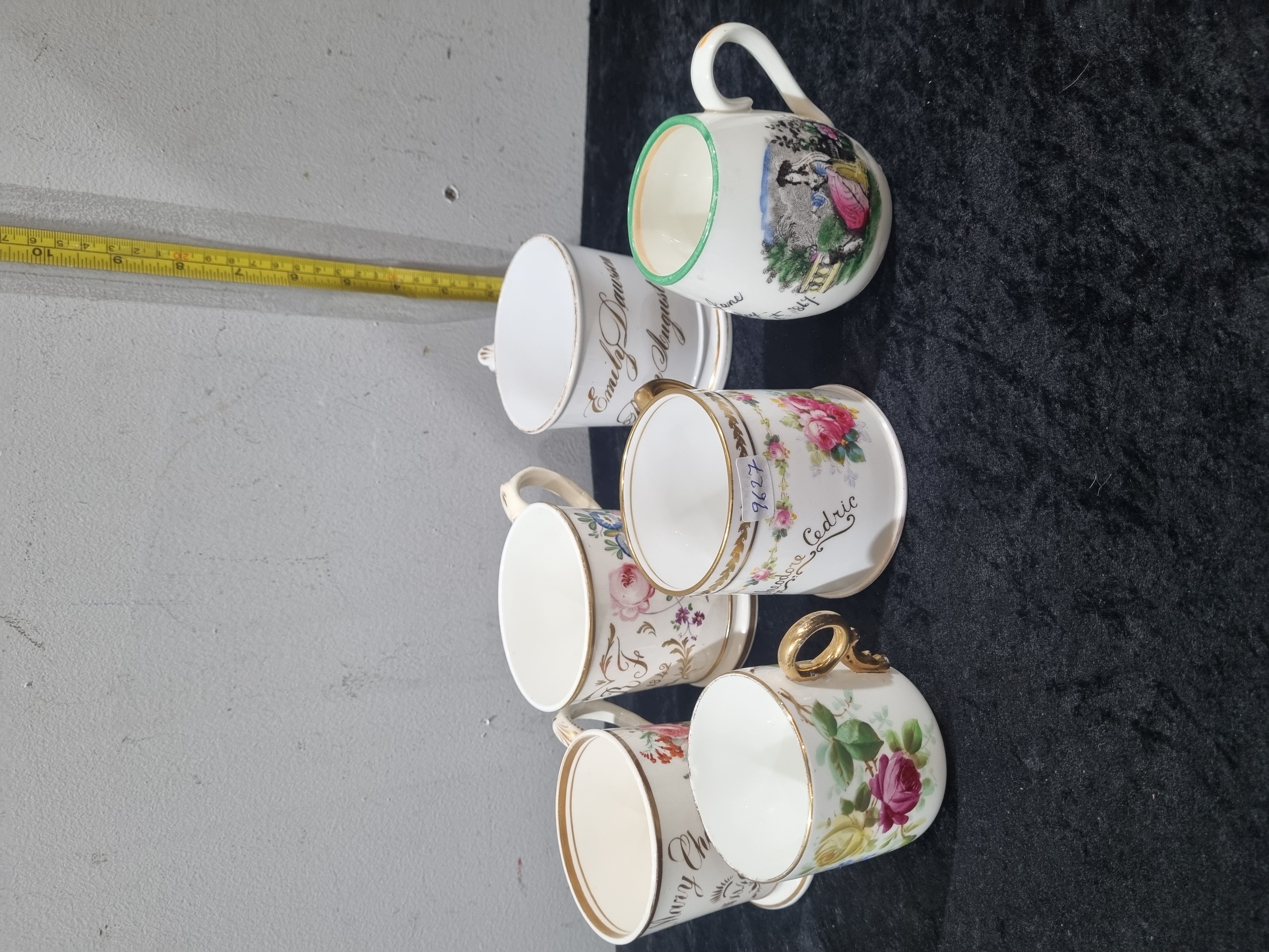 A collection of porcelain and bone china mugs of various sizes and forms, including cylindrical and rounded examples. The pieces are decorated with a combination of transfer-printed and hand-painted floral sprays, predominantly featuring roses, alongside gold-gilt rims and handles. Several mugs bear personalised cursive inscriptions in gold gilt or colour, including the names Emily Dawson, Theodore Cedric, and Mary Ch. One rounded mug is finished with a green-lined rim and depicts a landscape scene with a female figure, accompanied by a name and date. These items are characteristic of British commemorative or christening ware from the late 19th to early 20th century.