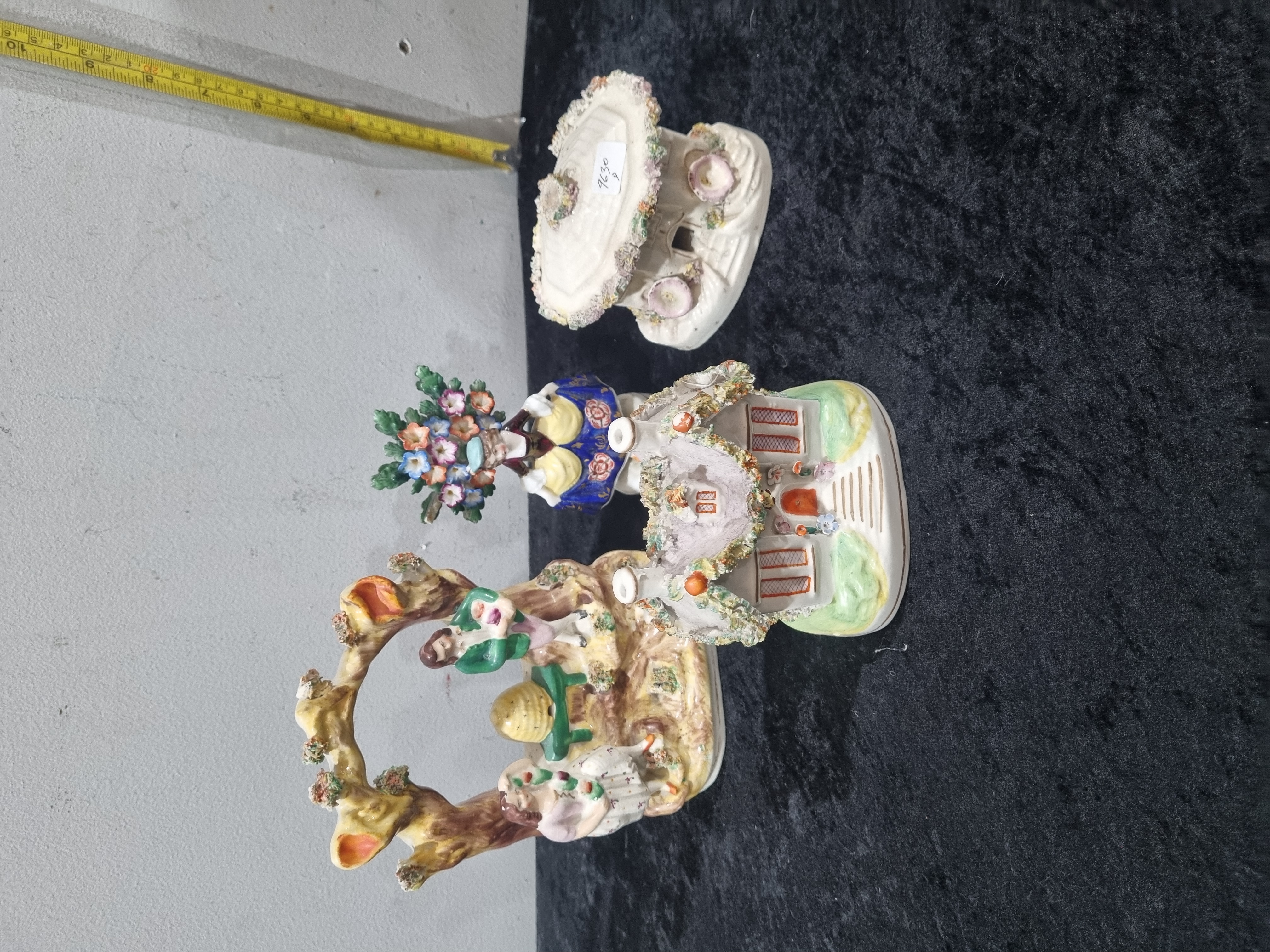 A collection of four ceramic items consistent with 19th-century Staffordshire pottery production. The lot includes a figural group depicting a man and woman in rural attire standing beneath a bocage tree with a central beehive on a four-legged stand, finished in polychrome glazes. A second figurine depicts a female figure supporting a large basket of flowers on her head, wearing a dark blue bodice with gilded highlights and a yellow skirt. The third item is a pastille burner modelled as a two-storey cottage or manor house with orange-painted windows and doors, featuring applied shredded clay decoration to represent moss or foliage. The final piece is a circular tiered decorative stand or lid featuring applied polychrome floral motifs around the central section and rim. All items are constructed from glazed earthenware or pearlware. No factory marks are visible; the circular piece bears a modern white rectangular inventory sticker with the handwritten numbers 9630 and a small symbol.