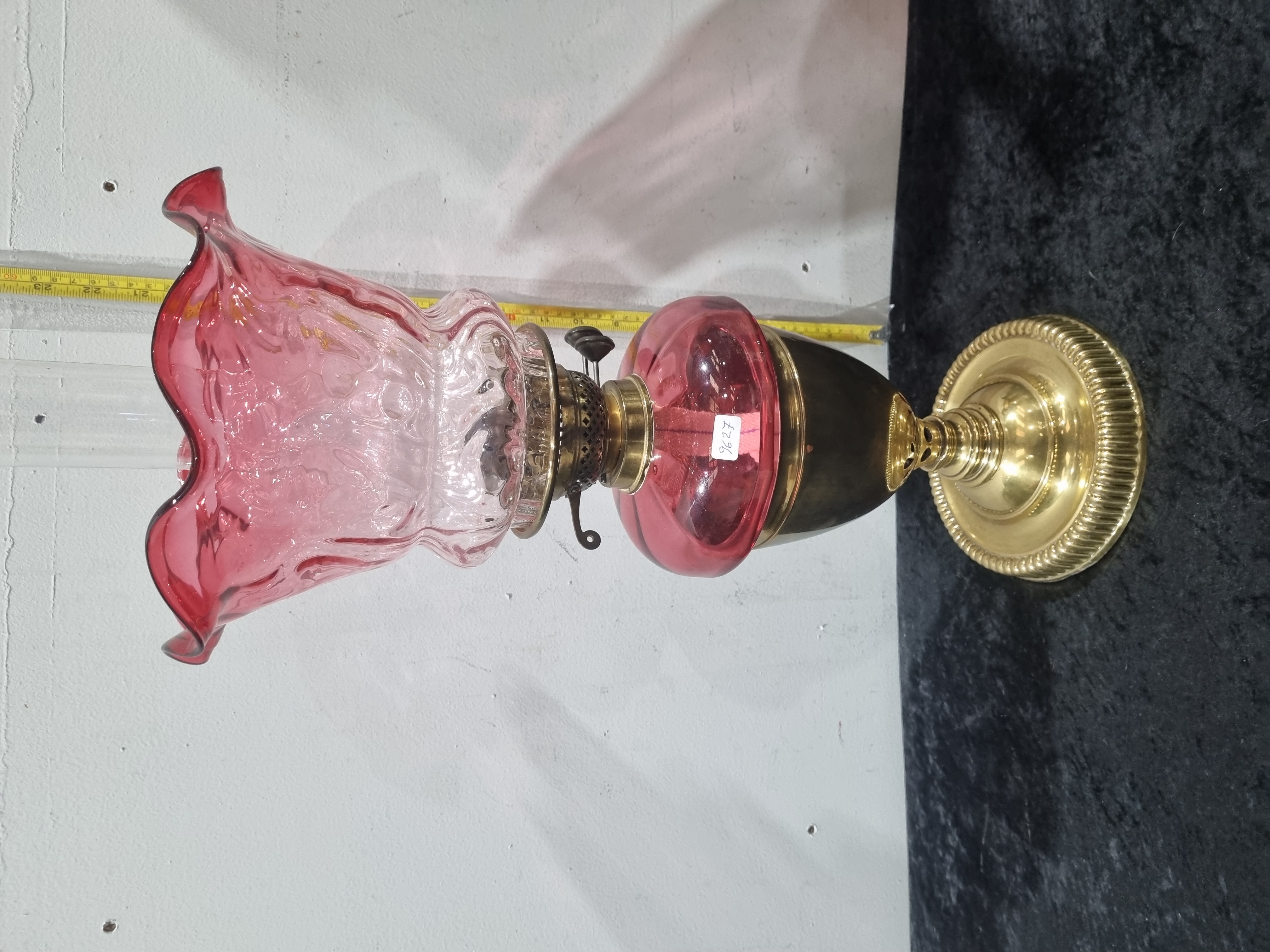 A Victorian Cranberry Glass and Brass Duplex Oil Lamp