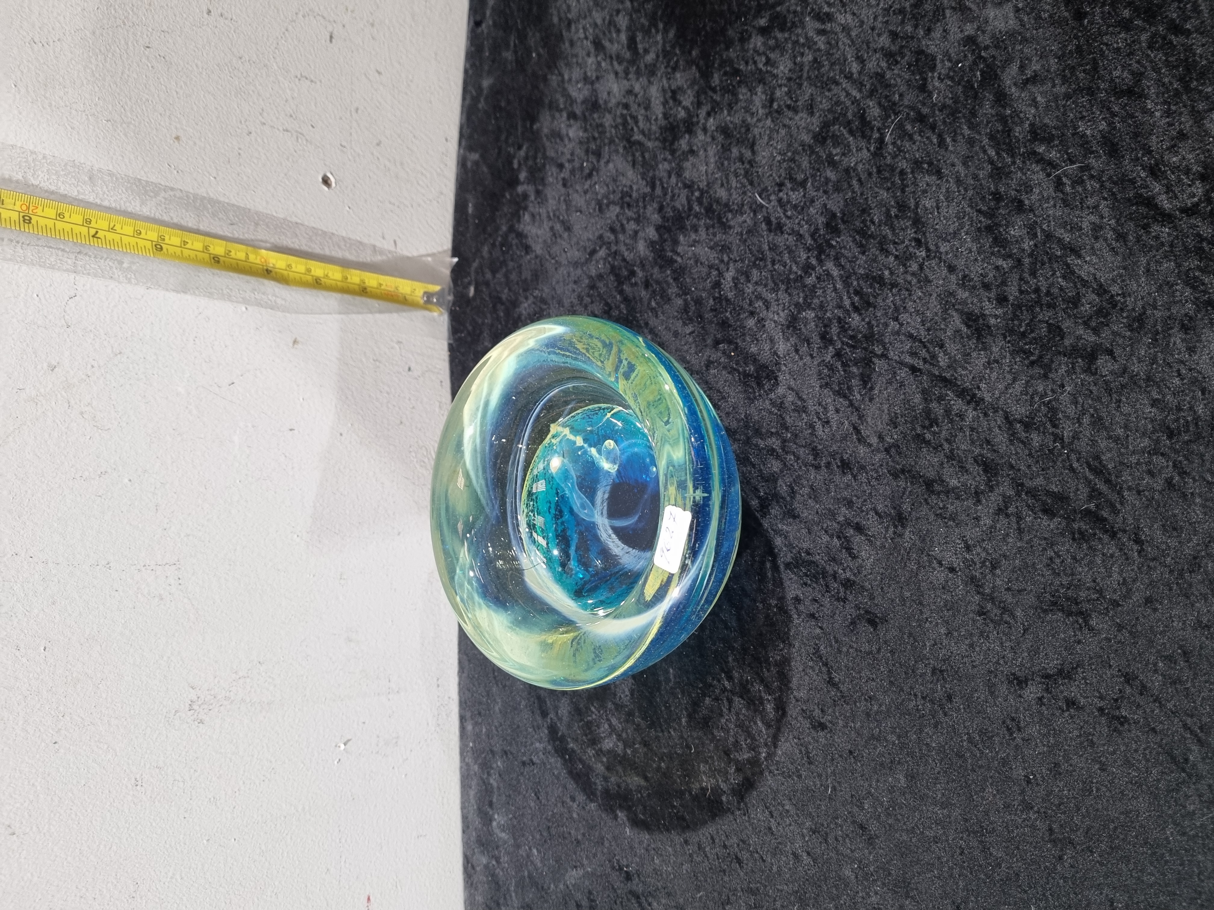 This item is a heavy, thick-walled art glass bowl or large paperweight, featuring a central core of vibrant blue encased within a clear glass body. The piece is decorated with internal swirling inclusions of pale lime-yellow and wisps of opaque white. The form is rounded with a slightly recessed top, produced using hand-blown art glass techniques with internal colour layering. The style and colour palette are characteristic of mid-century modern glass, specifically resembling the sommerso technique associated with Murano or the early output of Mdina Glass in Malta. A small white rectangular adhesive label is present on the interior wall, bearing the handwritten characters 7622, which appears to be a temporary inventory or lot number. No other maker’s marks, factory signatures, or acid-etched marks are visible on the base or body.