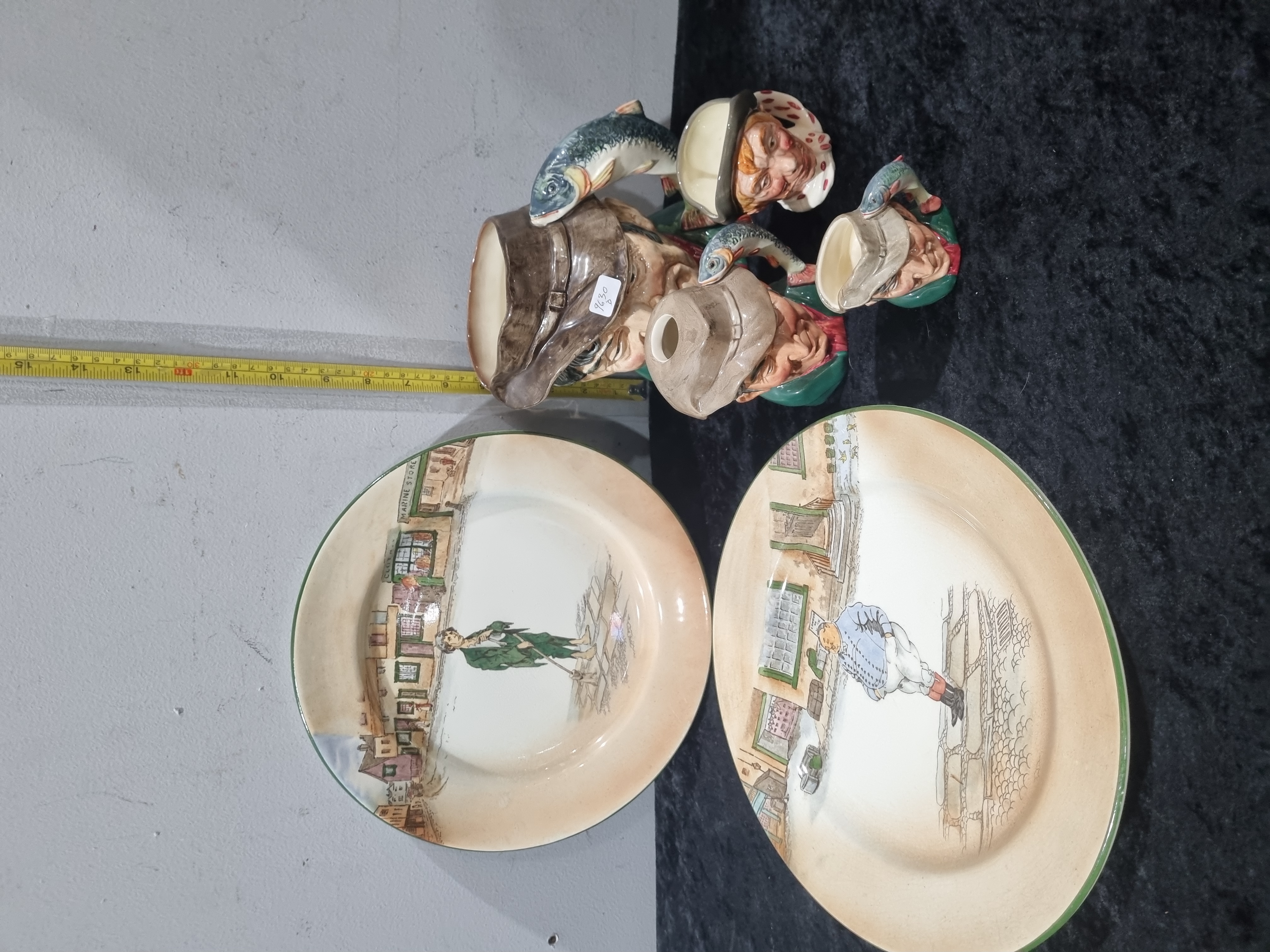 This collection of British earthenware ceramics includes two plates from the Royal Doulton Dickens Ware series and three graduated character jugs. The plates are decorated with transfer-printed scenes and hand-painted highlights depicting characters from Charles Dickens novels against Victorian architectural backdrops. One plate is identified by a backstamp as The Fat Boy from The Pickwick Papers, bearing the pattern number D3010 and the Royal Doulton Dickens Ware circular mark with a central profile portrait. The second plate depicts a character in a green coat standing before a building marked Marine Store. The three graduated character jugs are moulded in the form of a weathered fisherman wearing a brown hat, with a leaping fish incorporated into the design to form the handle. These jugs are produced in the style of The Poacher, a design originally created by Max Henk for Royal Doulton, though no factory marks are visible on the bases of these specific examples. The jugs are hand-painted in a palette of browns, greens, and flesh tones with a gloss glaze finish.