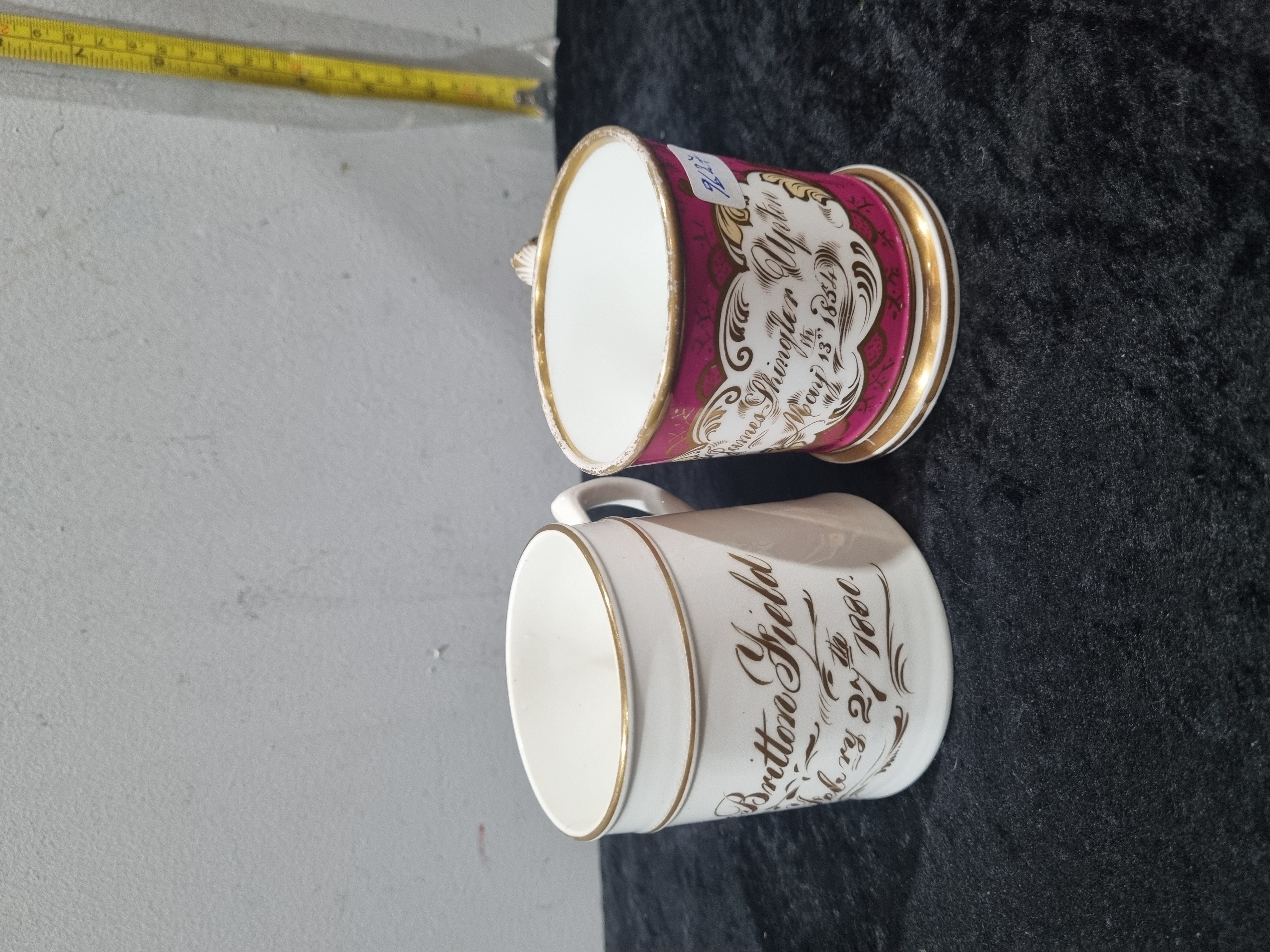 A pair of English porcelain or bone china presentation mugs dating to the mid-19th century. The first mug is of footed form with an ornate scrolled handle, featuring a magenta ground and a central white reserve framed by gilded scrollwork. It bears a hand-lettered inscription in black script reading Thomas Shingler Upton born May 13th 1854. The second mug is of cylindrical form with a simple loop handle and a white glazed ground. It features a hand-lettered gilded inscription reading Britton Field February 27th 1860, framed by decorative gilded flourishes. Both items are characteristic of the personalised giftware produced in the Staffordshire potteries during the Victorian era. No manufacturer marks are present.