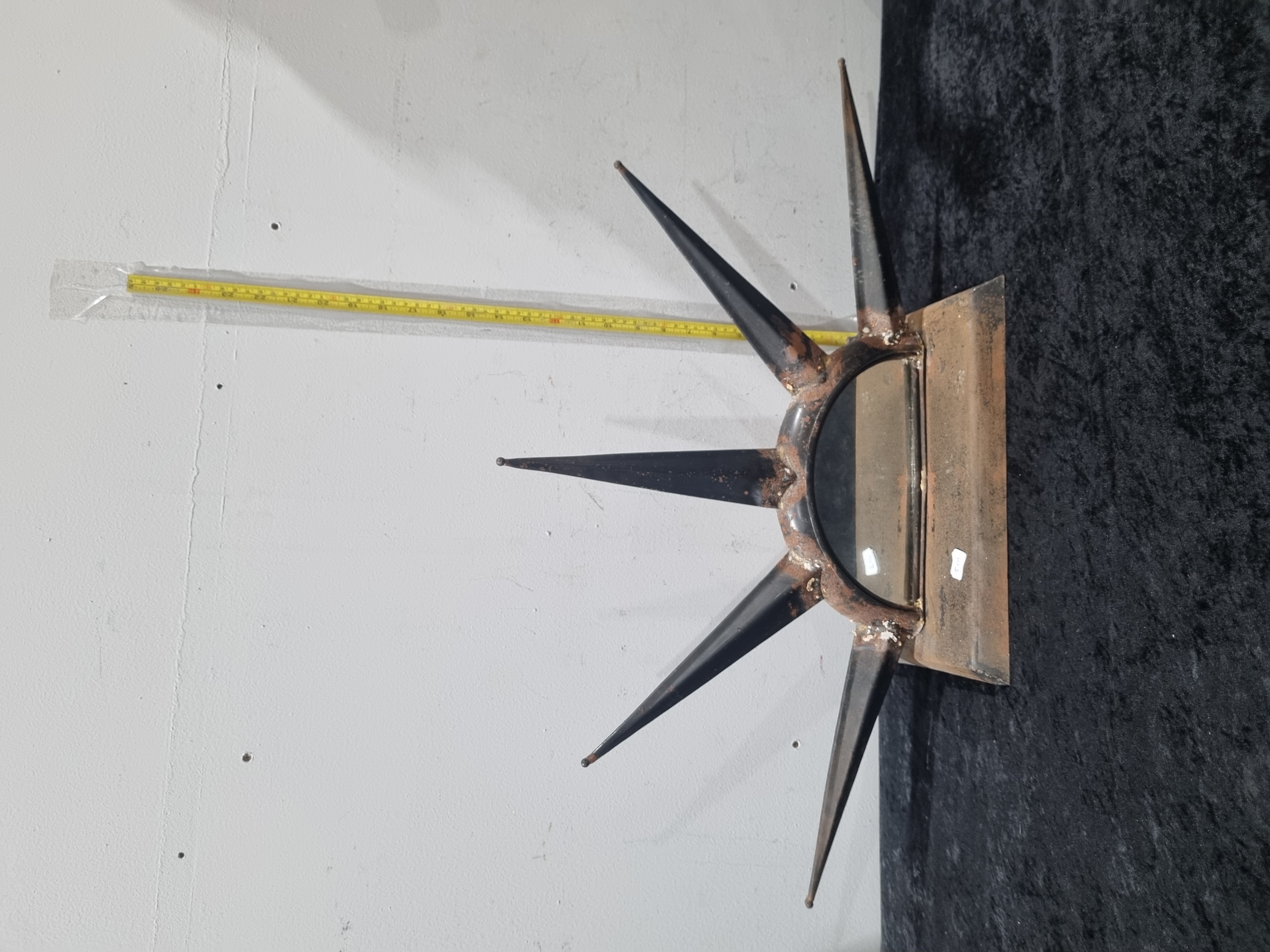 A sculptural metal decorative piece or wall-mounted installation fabricated from iron or steel. The object is designed in the form of a five-point radiant crown, resembling a diadem. The piece is constructed using industrial techniques, featuring five tapered conical spikes welded to a semi-circular band, which is mounted onto a heavy rectangular metal baseplate. Welding marks are clearly visible at the joinery points. No maker marks or signatures are present.