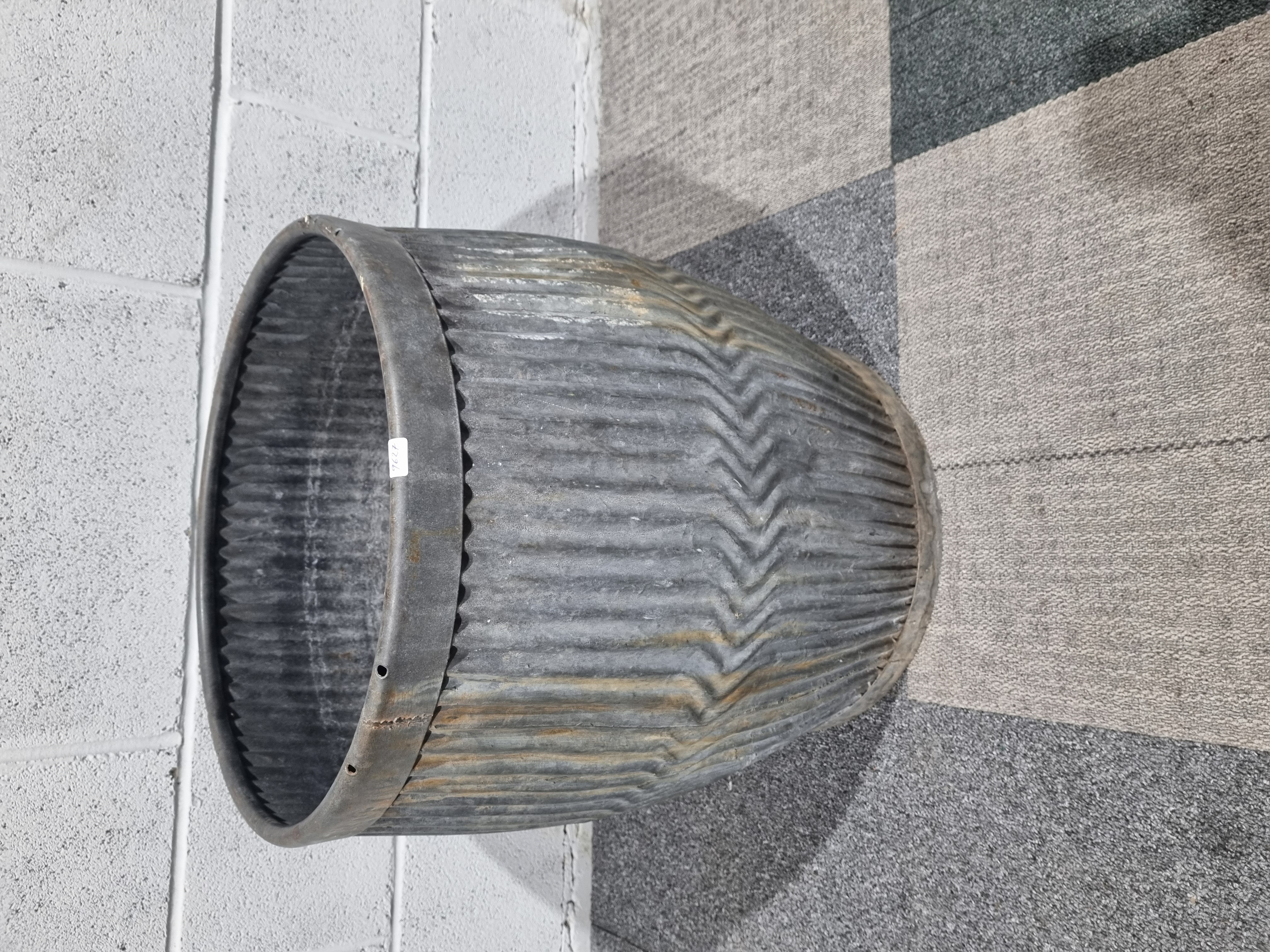 A mid-20th century industrial galvanised steel container of tapered circular form, commonly identified as a dolly tub. The piece features a corrugated body and a reinforced rolled rim with several small aperture holes. The construction is typical of utility equipment from the period, designed for durability. No maker’s marks or signatures are discernable; however, a small white adhesive label bearing the handwritten characters 9627 is affixed to the rim.