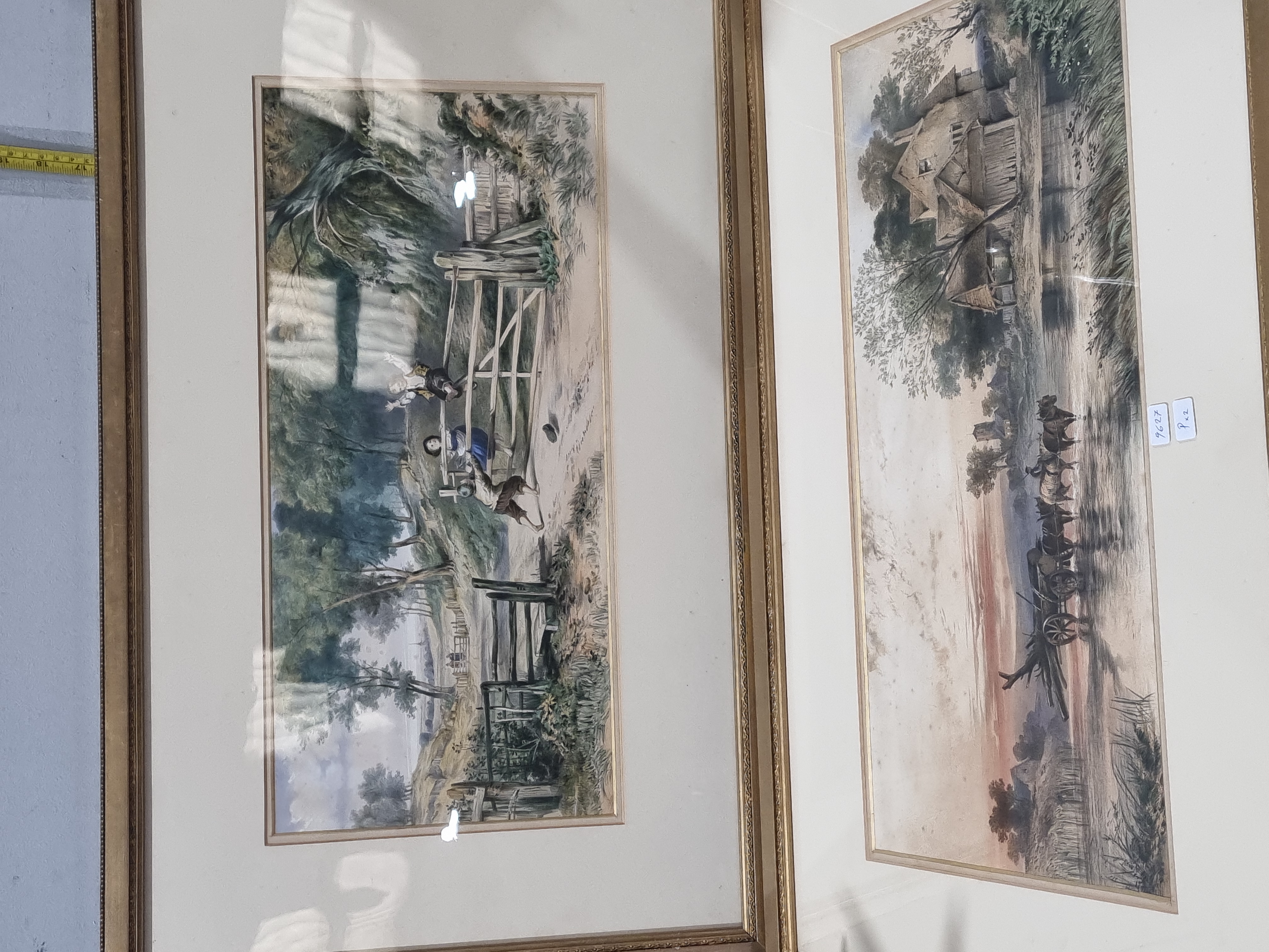 A pair of framed hand-coloured prints after celebrated pastoral works by John Constable. The first print depicts The Cornfield, featuring children by a wooden gate in a rural landscape. The second print depicts The Hay Wain, showing a horse-drawn wagon crossing a river beside a cottage. The technique appears to be hand-coloured engraving or lithography, executed in muted tones to replicate the original oil paintings. No edition numbers, signatures, or publisher marks are visible on the face of the prints. Both works are presented in ornate gilt-effect frames with off-white mounts under glass. A small white adhesive label is present on the mount of the right-hand print containing the handwritten characters 9, 6, 2, 7 and P, x, 2, likely serving as an internal inventory reference.