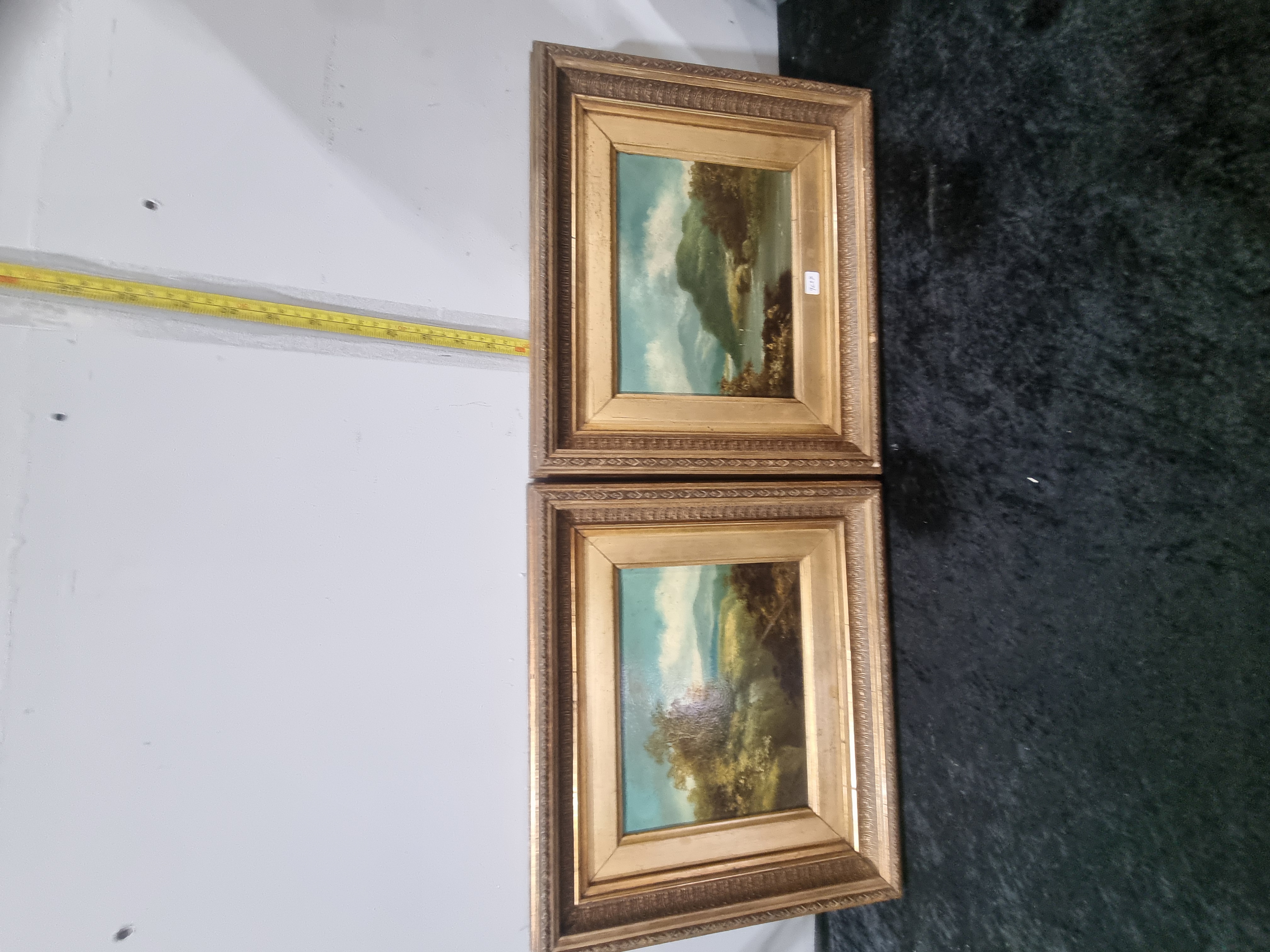 A pair of oil paintings on board, each depicting a traditional landscape scene. One work shows a mountainous vista with a lake reflection, while the other portrays a wooded, undulating landscape under a bright, cloudy sky. The paintings are executed in a representational style characteristic of the late 19th or early 20th century. Both items are housed in matching, ornate gilt-finished frames with deep profiles and beaded inner slips. A small white auction label is affixed to the inner frame of the upper painting. No signatures or inscriptions are visible on the face of the works.