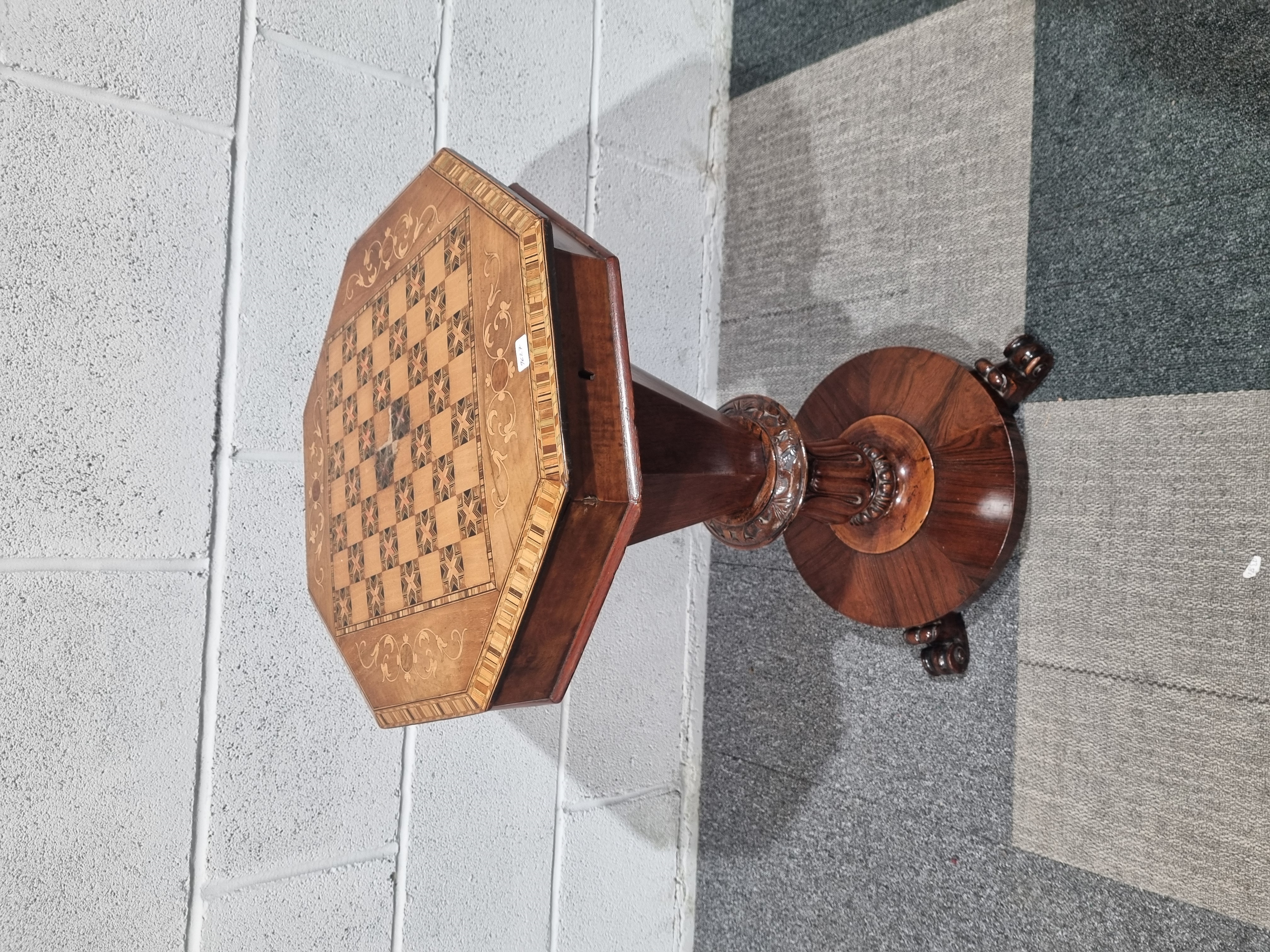 A Victorian walnut trumpet-form sewing and games table featuring marquetry and parquetry decoration. The hinged octagonal top displays a central inlaid checkerboard for chess or draughts, bordered by scrolling foliate marquetry and a geometric inlaid edge. The lid opens on brass hinges to reveal a fitted interior for needlework, lined with purple fabric and decorative paper, containing various vintage sewing notions. The tapering octagonal pedestal column terminates in a carved foliate collar above a circular platform base, supported by three carved scroll feet. A small white adhesive label marked 5276 is present on the interior of the lid. No maker’s marks are visible.