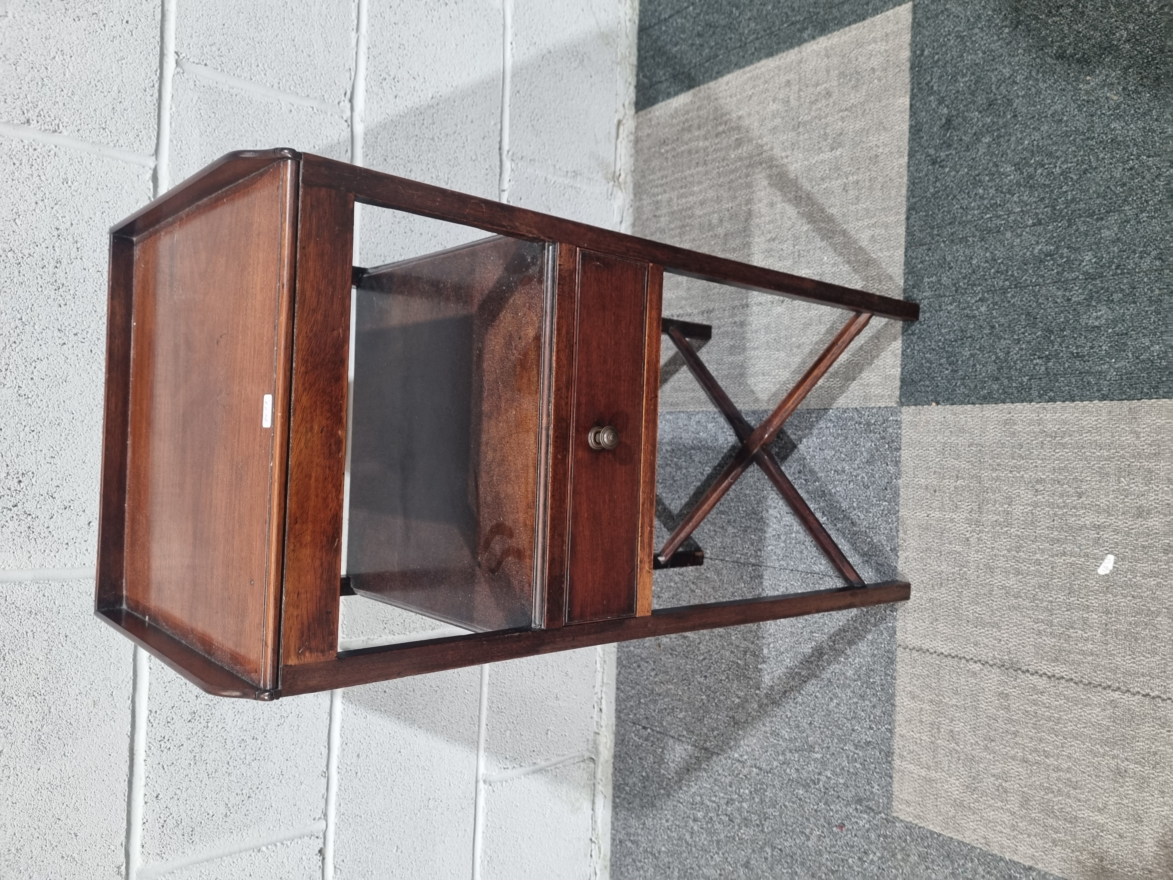 A mahogany washstand or bedside cabinet in the Georgian style. The piece features a tray-top with a raised gallery and rounded corners, positioned above an open compartment and a single frieze drawer. The drawer front is decorated with fine lightwood stringing and is fitted with a central turned wooden knob handle. The cabinet is raised on four slender square-section legs, which are reinforced by an X-shaped cross-stretcher. No maker’s marks, stamps, or labels are visible on the exterior, though a small white auction lot label is attached to one side.