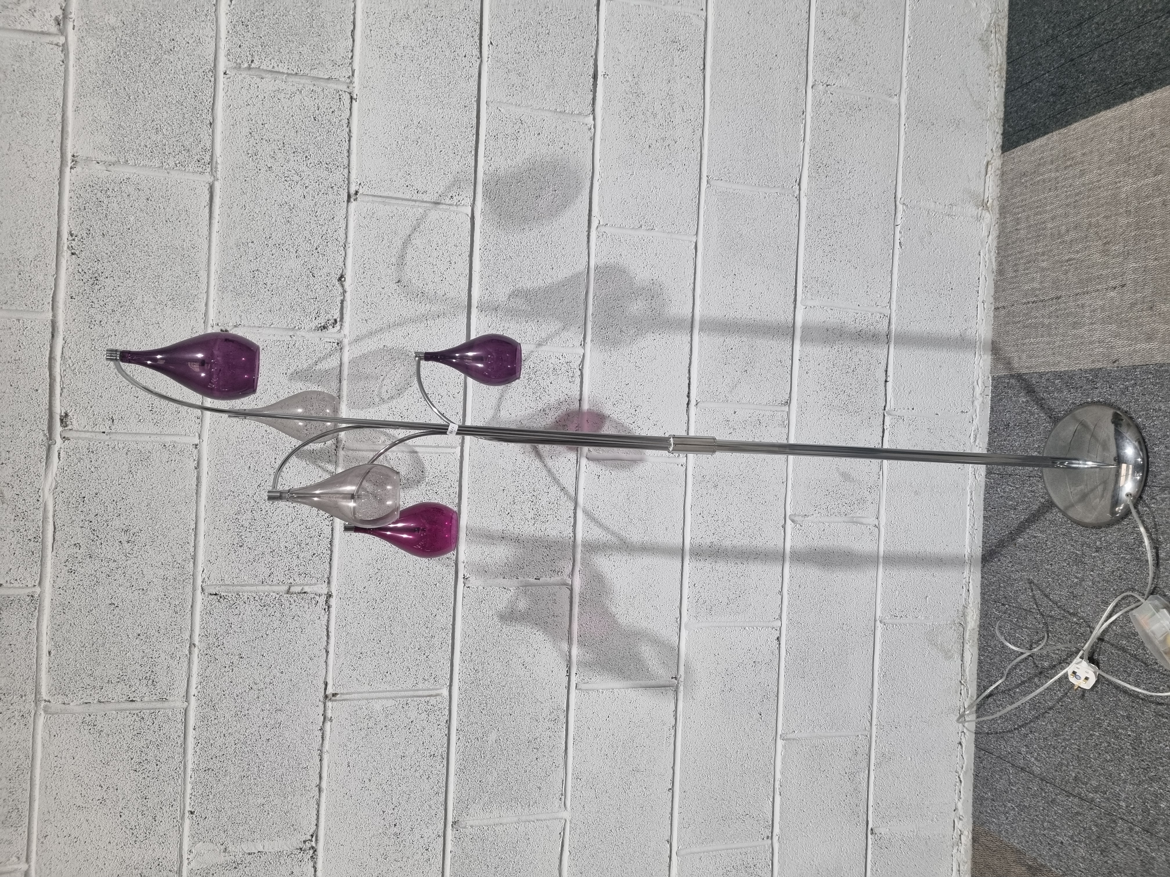 A modern multi-light floor lamp, identified as the Hanbury model by Next. The construction features a polished chrome-finished domed circular base and a central cylindrical stem. The stem branches into five curved arms of varying lengths, each terminating in a teardrop-shaped glass shade. The shades are finished in alternating purple and clear glass. The lamp is fitted with a white electrical flex and a standard UK three-pin plug. A small white label is present on the central stem.