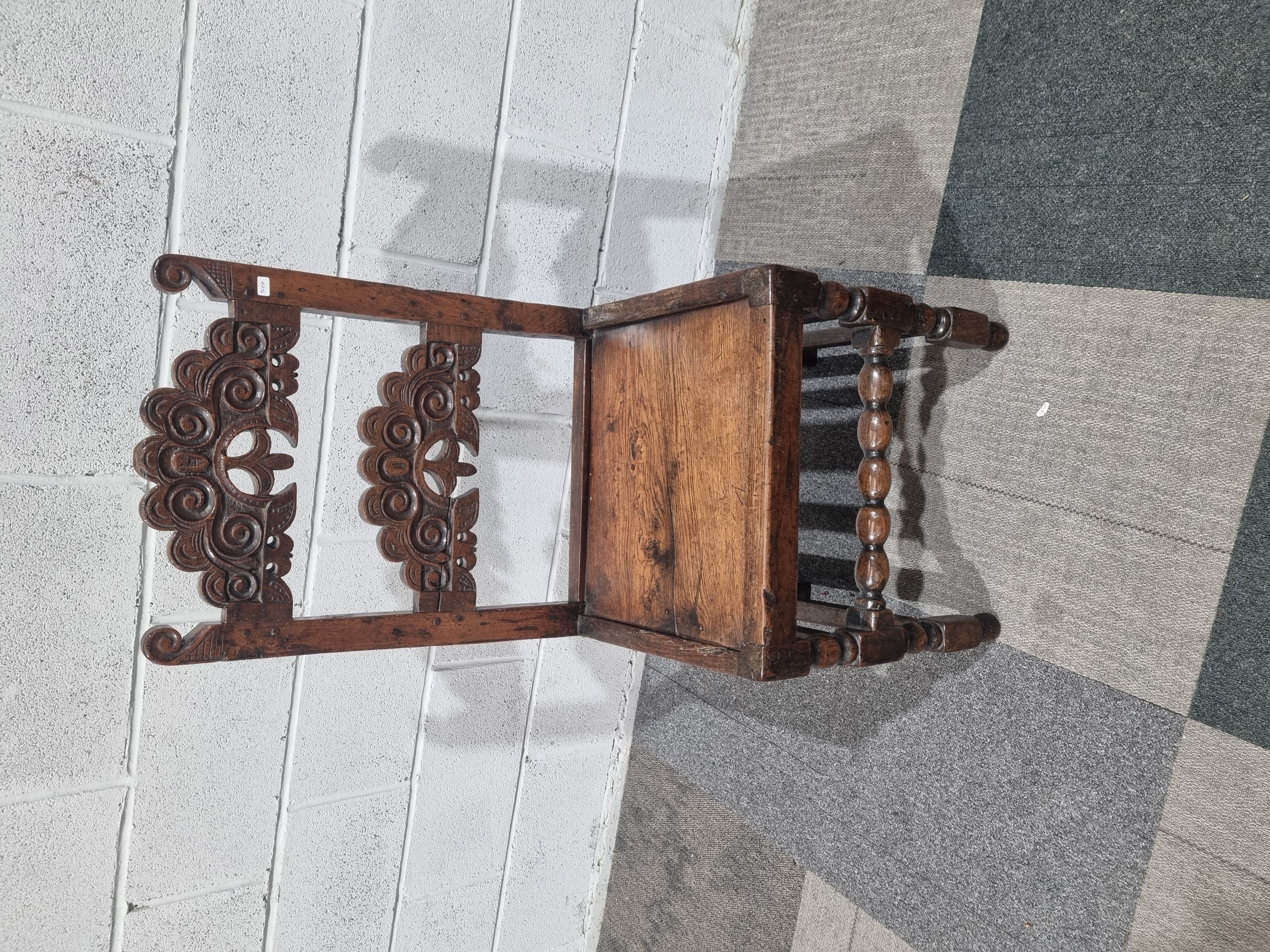 A 17th century style oak side chair, of Yorkshire or Derbyshire backstool form, constructed from solid oak with a deep patina. The backrest is composed of two horizontal splats, both elaborately carved and pierced with scrolled foliate motifs, set between uprights terminating in scrolled finials. The chair features a solid inset panel seat and stands on bobbin-turned front legs joined by a corresponding turned front stretcher. The rear legs are of square section, joined by plain side and back stretchers. Construction utilizes pegged mortise and tenon joinery throughout. A small white adhesive label is present on the upper back rail. No maker’s marks or stamps are discernible.
