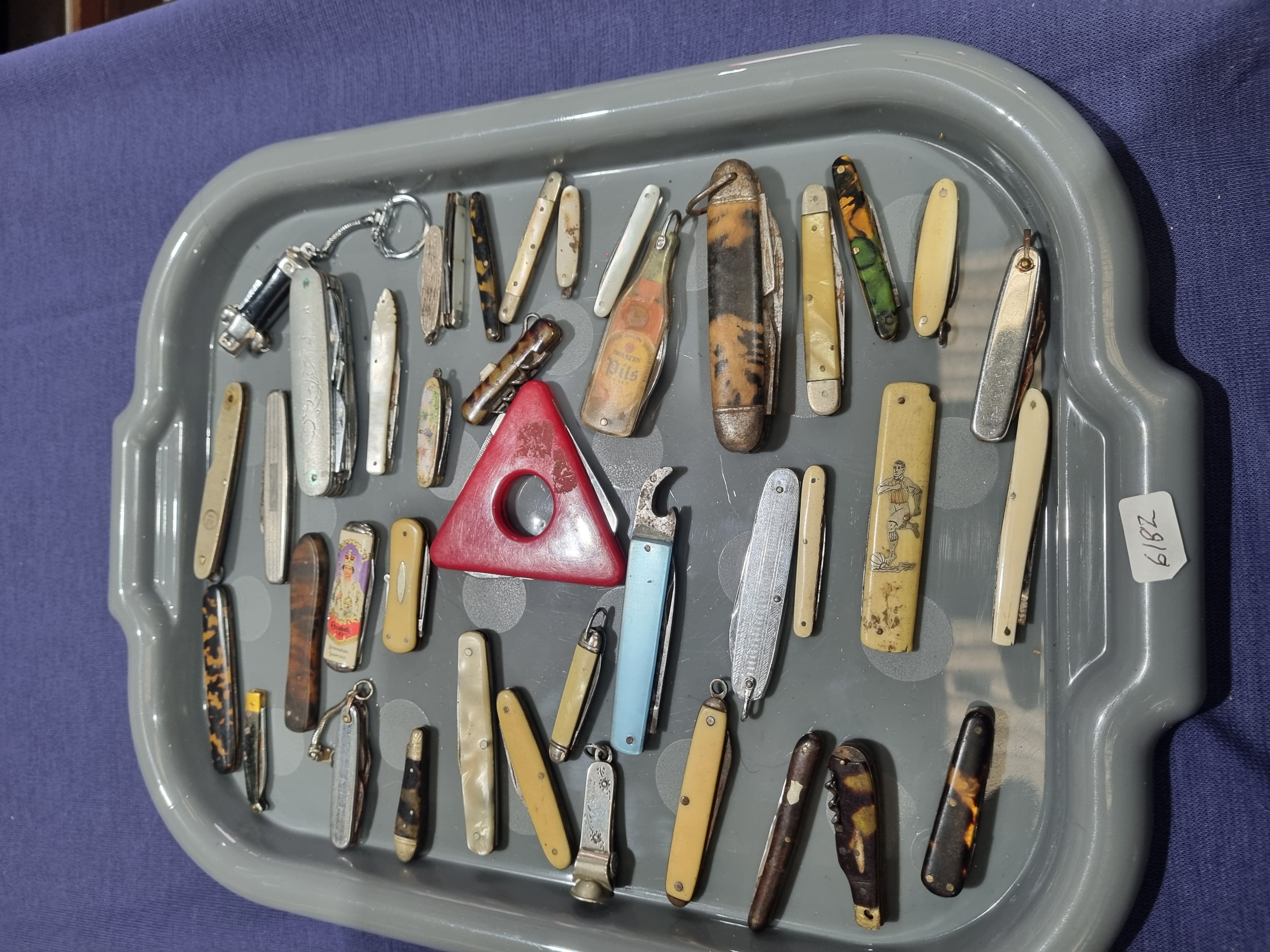 This lot consists of approximately 32 vintage and antique folding pocket knives and specialized small tools. The collection includes a variety of forms such as traditional penknives, novelty advertising pieces, and commemorative items. Notable examples include a bottle-shaped advertising knife for Holsten Pils, a souvenir knife for the Coronation of Queen Elizabeth II dated June 2nd 1953, and a rectangular cream-handled knife featuring a graphic of a football player. The assortment features various handle materials including mother-of-pearl, faux pearl, celluloid with faux tortoiseshell patterns, bone, and embossed metal with scrollwork decoration. Specialized implements within the group include a red triangular tool, a small metal whistle, corkscrews, and bottle openers. The blades are constructed from steel with various folding mechanisms.