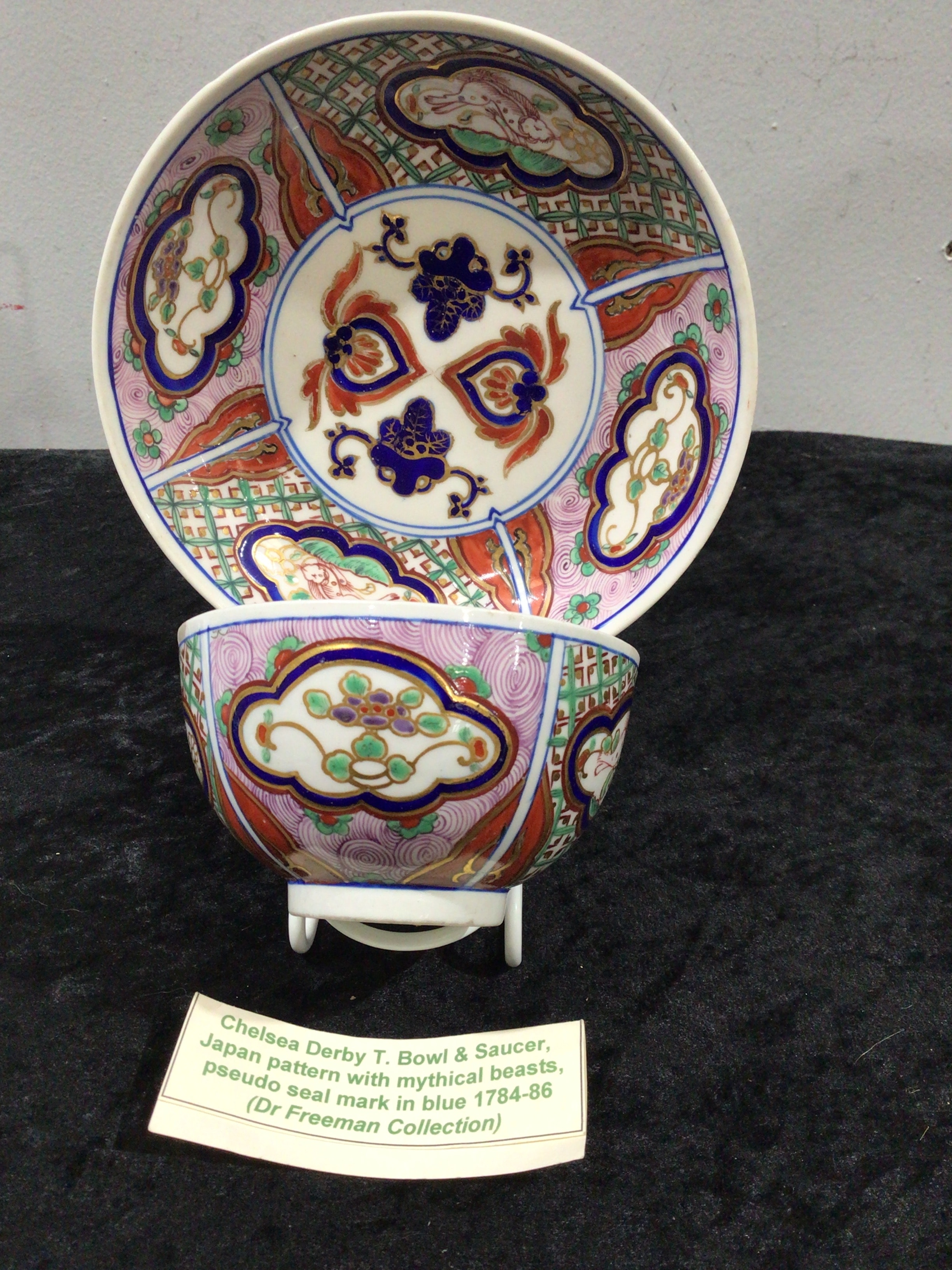 A Chelsea Derby tea bowl and saucer set, dating to circa 1784-86, decorated in the vibrant Japan pattern. The polychrome enamels include red, blue, green, and pink, accented with gilding, depicting mythical beasts, geometric patterns, and stylized floral motifs. A blue pseudo seal mark is visible in the center of the saucer, with another rectangular blue mark on its reverse. The set bears labels identifying it as from the ‘Dr. J. R. Freeman Collection’ (P58976/2 and P58976/1 for the cup) and ‘Stoke-on-Trent City Museum & Art Gallery C 2455’.