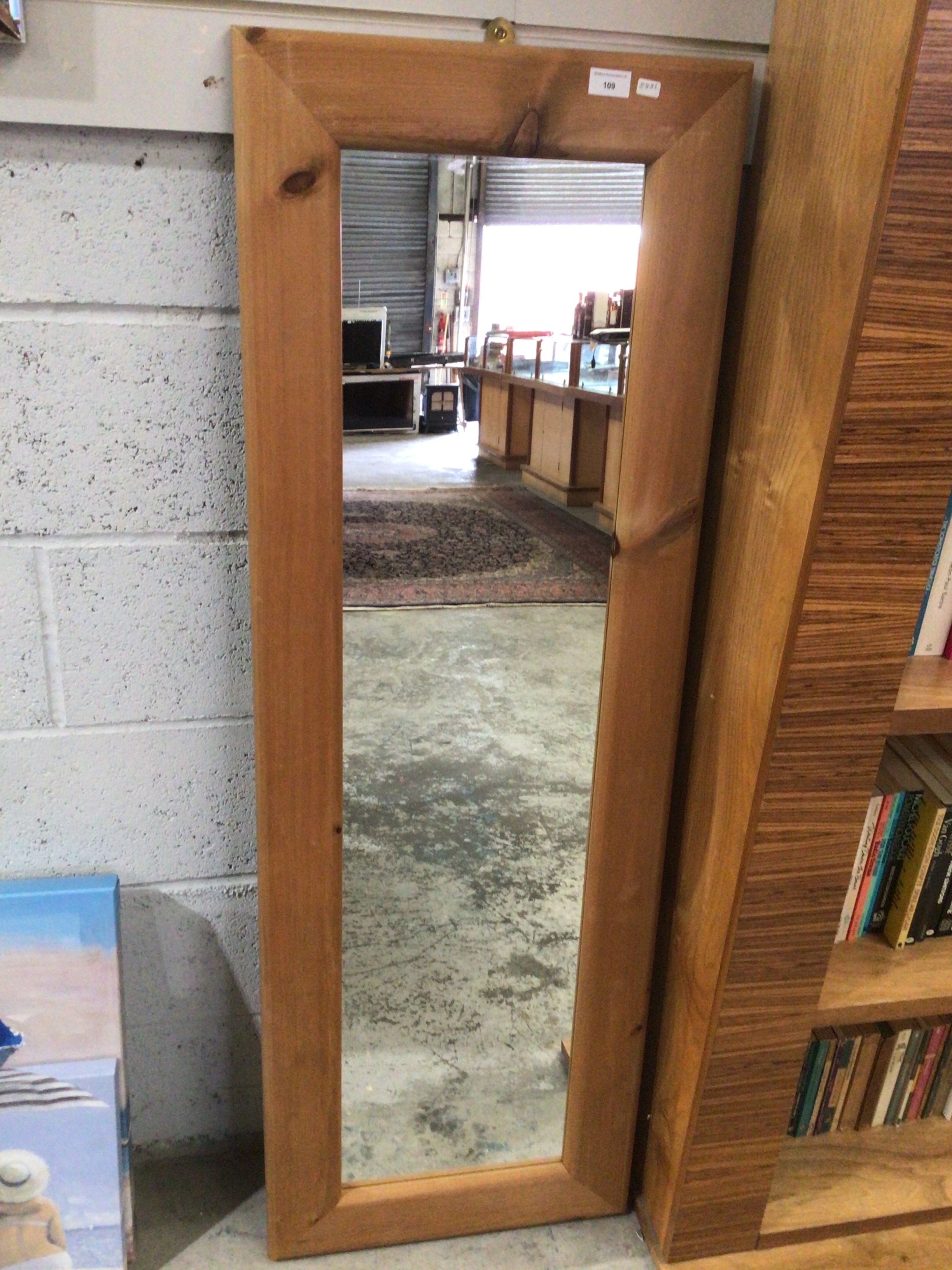 A rectangular, full-length wall mirror featuring a plain, relatively thick frame constructed from a light-colored softwood, likely pine, with prominent visible grain and natural knots, suggesting a contemporary or modern rustic style. A white adhesive label on the upper right frame bears the number ‘109’ and smaller text possibly reading ‘Stoker Auctions.co.uk’.