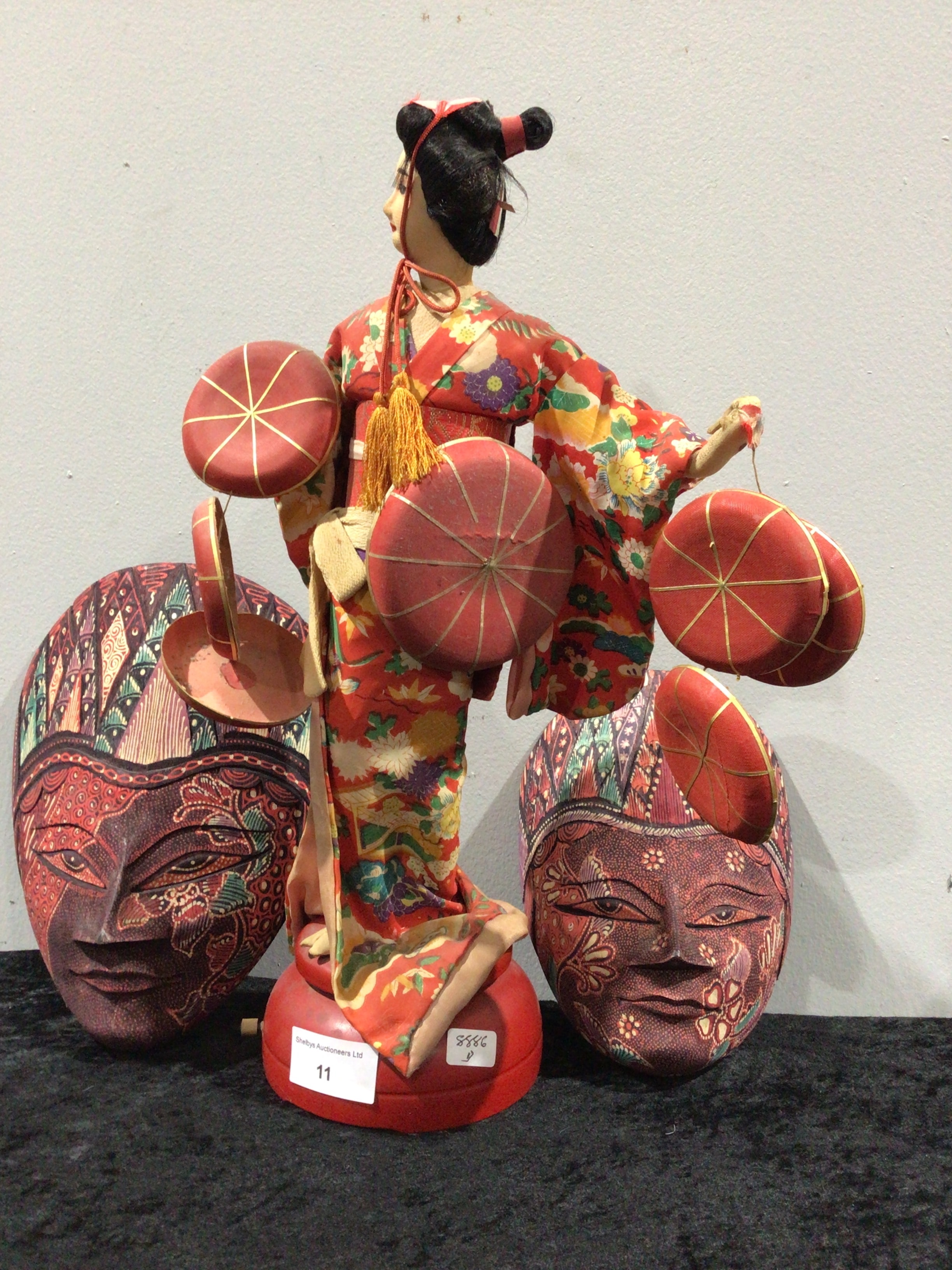 A Japanese Geisha Doll, featuring a composition head and hands, dressed in a vibrant floral-patterned fabric kimono with a yellow obi. The doll holds several small red parasol-like items, and stands on a red tiered base. Accompanying the doll are two carved wooden masks, each featuring intricate painted patterns in red, brown, green, and cream, depicting stylized faces. The doll’s base bears a ‘Sheldons Auctioneers Ltd’ sticker marked ’11’ and a handwritten ‘3366’.