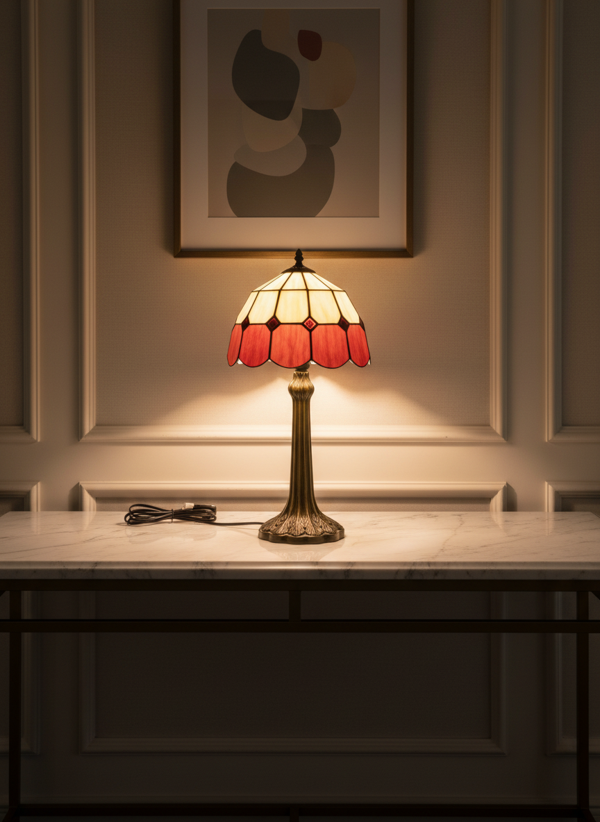 A stained glass table lamp with a white/cream and red shade and a dark bronze/antiqued brass base, made in China.