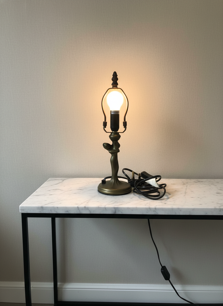 A brass-colored table lamp featuring a figural woman base, a dark brown harp, a white light bulb with “MAX” visible on its label, and a black cord with a UK-style plug.